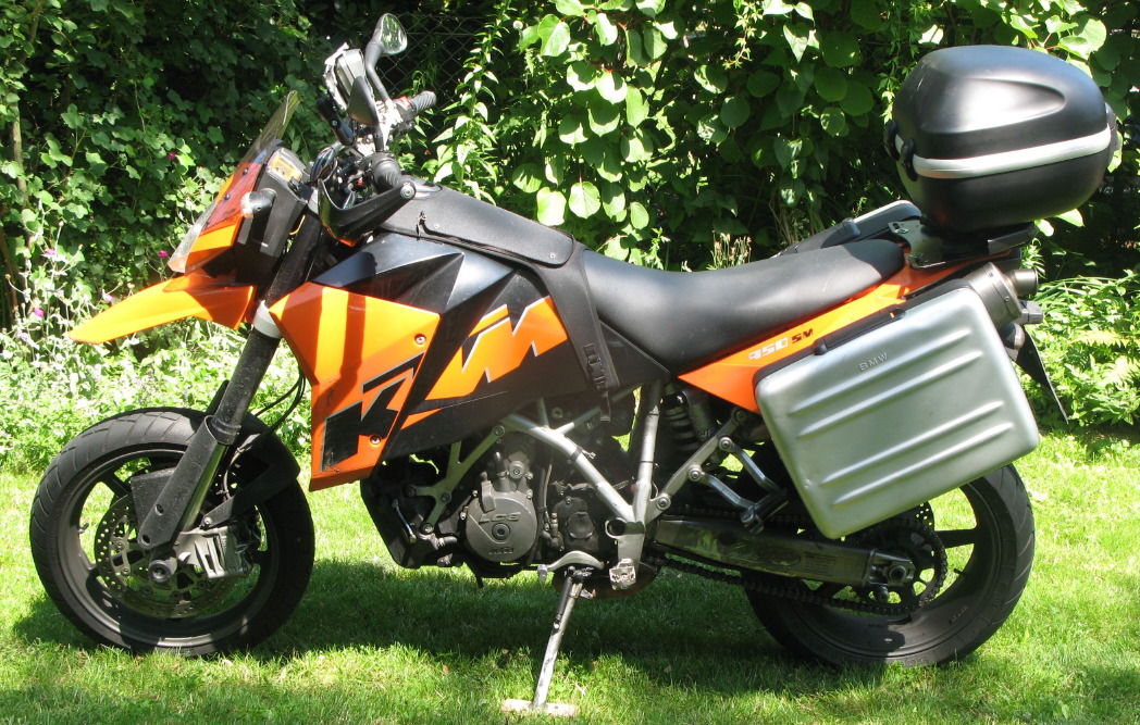 ich möchte nun die Geschichte von love-is-live über die F650 GS Koffer an der 950 R nun hier weiterführen und euch ein paar Bilder zeigen wie es an der SM ausschaut. Die Bedenken von Schradt, das die Koffer im voll eingefederten Zustand mit der Schwinge in Berührung kommen könnten, trifft hier nicht zu. Das Gepäcksystem sieht zwar besch….. aus, aber in der Not frisst der Teufel Fliegen.