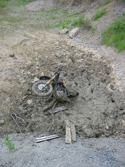 Reingefahren und das Mofa versank fast bis zum Gepäckträger im Schlamm. Gabel wer, Tank im Schlamm, Sitz hat gerade noch rausgeschaut
