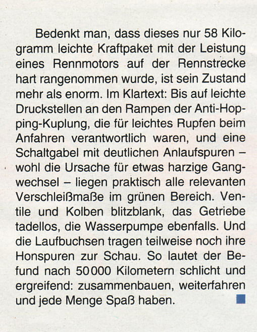 Dann such Dir mal die ReiseMotorrad von vor einigen Monaten raus, dort wurde die 990 nach 50.000 in Ursensollen in ihre Einzelteile zerlegt und mit einem noch besseren Ergebnis vermessen (und wieder zusammengebaut)! Alles im absolut grünen Bereich und die allermeisten Teile noch im Urzustand. Und die Maschine hat auf den meisten der 50.000 leiden müssen, neben ständigen Einsätzen im Reisebetrieb wurde sie u.a. auf den Erzberg getrieben und wurde von ständig wechselnden Fahrern (inkl. mir) geknechtet....