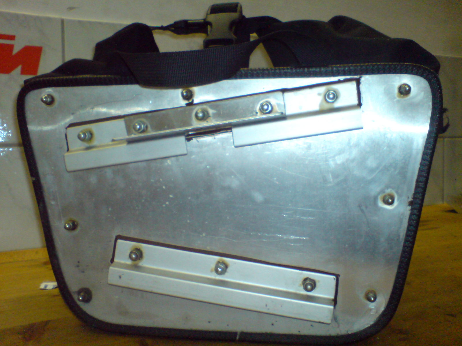 Weil mich das und die "lapprige" Kunststoffinnenversteifung der Taschen genervt hat, hab ich die Halterung der Taschen mit einem 2 mm Alu-Blech als Innenversteifung und einen 2 mm Alu Z-Profil sowie einem 3 mm Alu Flachmaterial ( alles pulverbeschichtet ) überarbeitet. Als "Verriegelung", damit die Taschen sich nicht unbeabsichtigt von Träger lösen, habe ich je Tasche nun 2 Flügelschrauben mit Kunststoffkopf verwendet ( Die Schrauben mit den Sterngriffen auf den Bildern hatten sich als unpraktisch erwiesen). Innen sind alle Sicherungsmuttern mit Kunststoffabdeckkappen versehen. Zweitmotorrad konnte mir als "Hinterherfahrender" bei einer "Probefahrt" bestätigen, dass weder was verrutschte, noch irgendetwas wackelte.