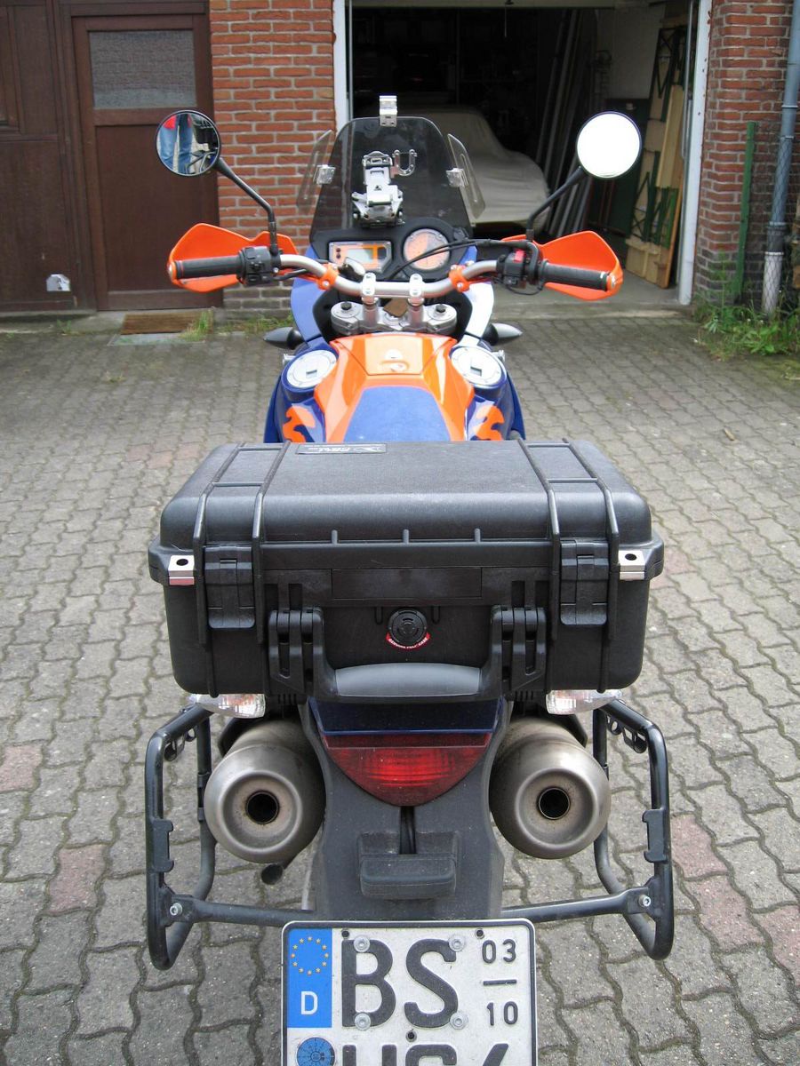 @bruggma - der peli case ist 12,7 cm hoch und fest mit/an der kofferträgerhalteplatte verschraubt - den zerlegt es als letztes und abfliegen tut der nie nich. nein, kamera kommt in den tankrucksack. dort kommen alle möglichen schnell zur hand sein müssende teile rein - da der tankrucksack von der kameraausrüstung befüllt ist.
