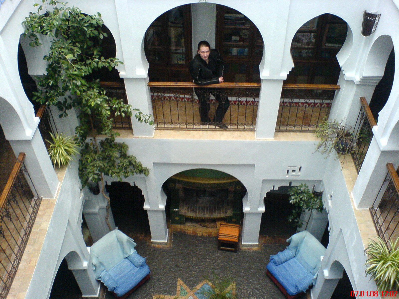 Weil der Sonnenuntergang nahte, steuerten wir das nächste vertrauenswürdige Hotel (Yacouta 350 DH die Nacht), ruhiges, liebevoll eingerichtetes Zimmer im Hochhaus (Ausblick!) und einer akzeptablen Tiefgarage fürs beste Stück. Am Rolltor war vor 20 Jahren mal ein Motor eingebaut, der war weg aber eine Eisenstange tuts auch. Beim Betrachten des getauschten Geldes vielen unterschiedliche 100er Scheine auf, böser Verdacht ! Die befragte freundliche Rezeptionistin wunderte sich nur, dass man sich an sowas stören kann, alles gültig ! Dazu gabs von Ihr eine schöne Einführung in die marokkanische Monarchie anhand der abgebildeten Könige.
