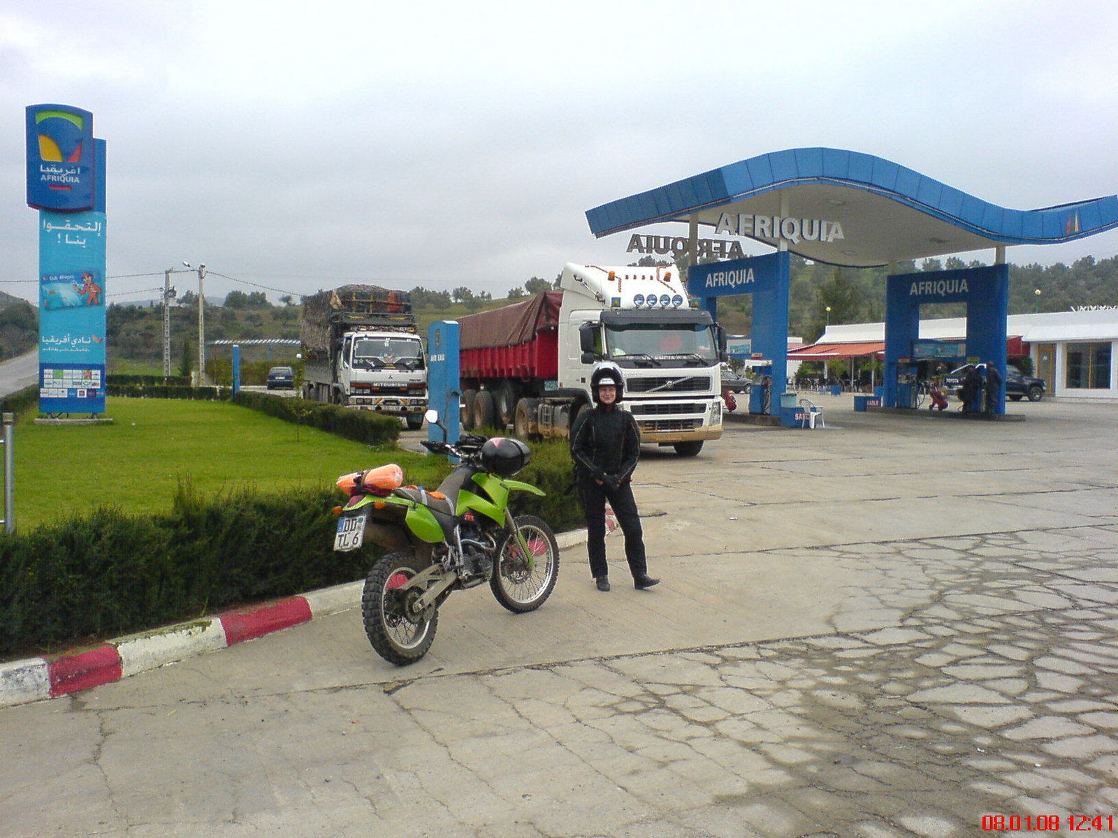 Das was es auf dem Stück bis Tetouan zu sehen gab, brachte uns verwöhnten mitteleuropäischen Neulingen einen Kulturschock und nahezu zum sofortigen Umkehren (osteurop. Verhälnisse sind uns durchaus bekannt ! ). Wilde Bauwut überall: Die Baustellensicherung der Schnellstrasse bestand aus Feldsteinen, die vorort mit weißer Farbe überschüttet waren, im Straßengraben weilten verschleierte Frauen mit Unmengen Gepäckbergen, Müll, Lärm, Dreck und Fahrzeuge, die hier nichtmal der Autoverwerter haben will. Unrasierte Männer ohne Zähne in Kapuzengewändern, die einem Haschisch anbieten, wenn man nur Schritttempo fährt. Angst überhaupt anzuhalten, weil man noch nicht einschätzen konnte ob es gefährlich oder normal ist. Liegengebliebene Engländer mit BMW-Motorrad versucht zu helfen. Unzählige Polizeikontrollen mit Nagelgurten auf der Strasse passiert. Unbeschreibliches. Angst.