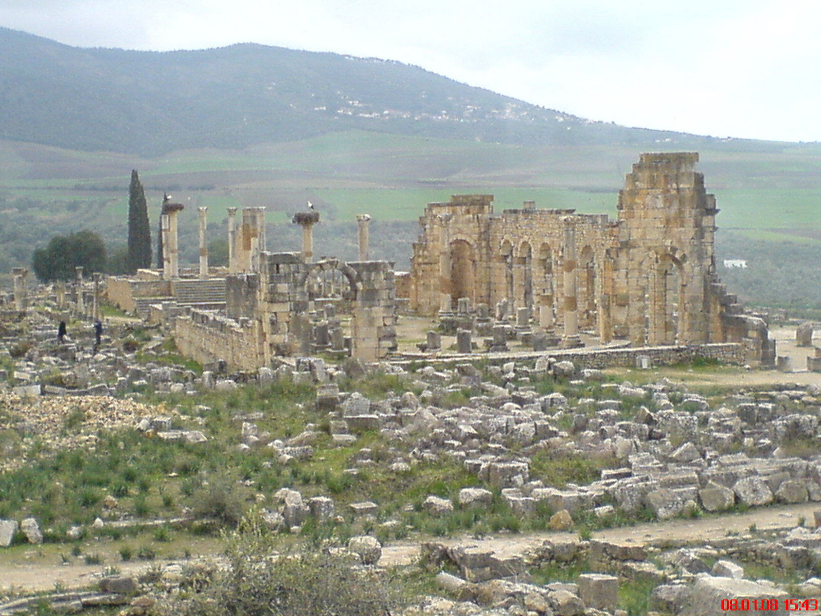 Nun waren wir hier etwas warm und sicherer geworden, da half auch das gutzureden von Deutschen, die gerade aus Togo kamen, das hier weder erschlagen, ausgeraubt noch an jeder Ecke betrogen wird. (Hoffentlich bleibt das so, wenn wir weiterhin Deutschland am Hindukusch verteidigen müssen und Kollateralschäden hingenommen werden) Weiter gings in Richtung Meknes/Fes nach Volubilis, einer großen gut erhaltenen schönen Ausgrabungsstätte aus der Römerzeit.