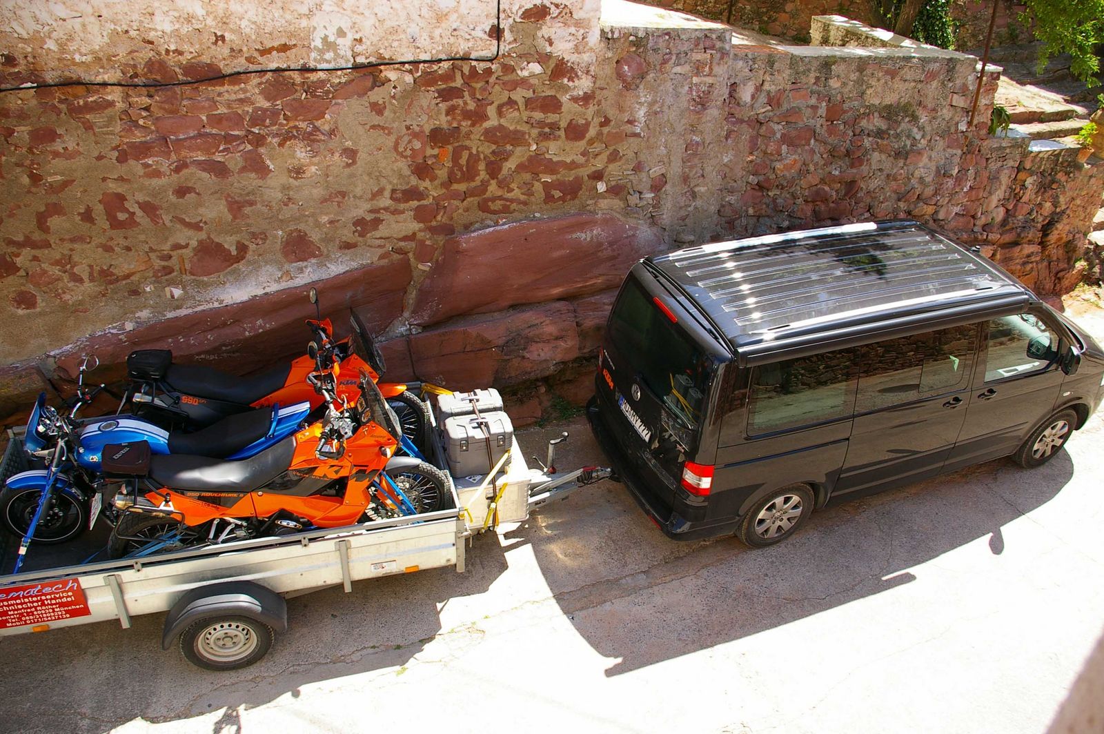 Darum haben wir uns einen Anhänger angeschaft. Wir reisen meist mit 2 o 3 Mopeds. Ziel: Castellon (80km nördlich v Valencia) Wir haben auch schon alle möglichen und unmöglichen Versionen durchgedacht und durchgerechnet. Da wir das Glück haben zu viert mit 3 Moped´s reisen ist nichts andere billiger als Hänger ans Töff rein in die Dose und los geht´s. Kaum 19 Stunden später sind wir schon am 1860km entfernten Ziel Wink