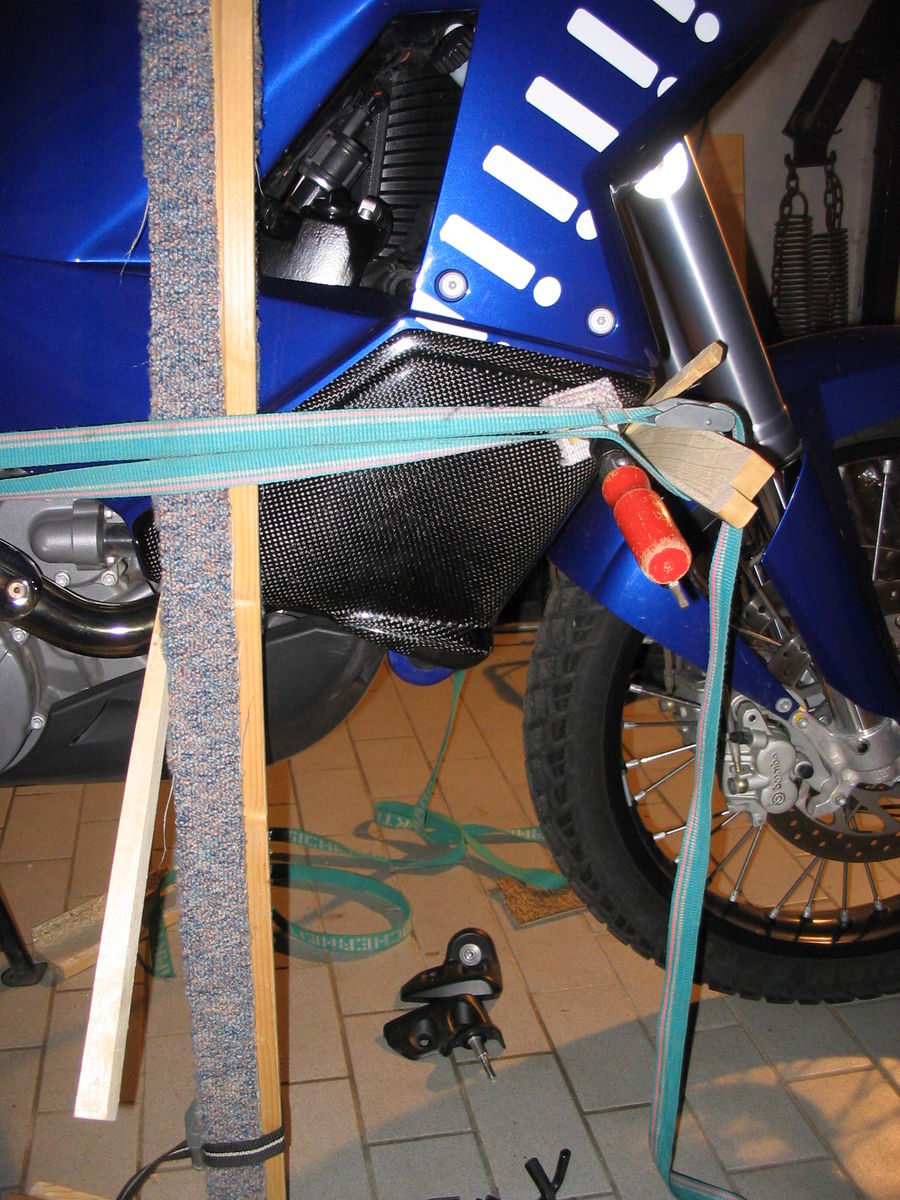 Wegen der Carbon-Ecken. Besorg Dir ein gutes Klebesilikon (nicht das billige Sanitärsilikon aus dem Baumarkt) und das Aufkleben ist kein Problem. (Die Klebestellen reinigen nicht vergessen) Leider waren die Carbon-Tankschützer die ich bisher bei 2 LC8 verbaut habe nicht sehr passgenau. Hab dann mit ein paar Spanngurten, Schraubzwingen und etwas kreativem "Vorrichtungsbau" nachgeholfen. Zum Schluss den Übergang zwischen Tankschutz und Tank noch mit Silikon versiegeln, damit kein Schmutz hinter die Schützer gelangen kann und dort eventuell den Tank zerkratzt.