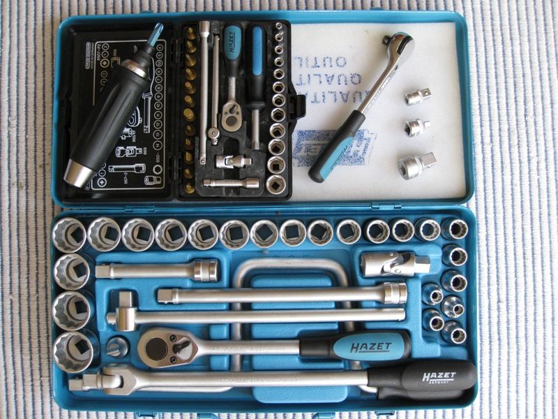 | Hazet Knarrenkasten 1/4 und 1/2 Zoll, 3 Adpater (3/8 zu 1/4 + 3/8 zu 1/2 + 1/4 zu 3/8) , ne Feinzahnknarre in 3/8 Zoll (wenns mal Eng wird) und nen Schlagschrauber für gaaanz feste Dinger ! |
