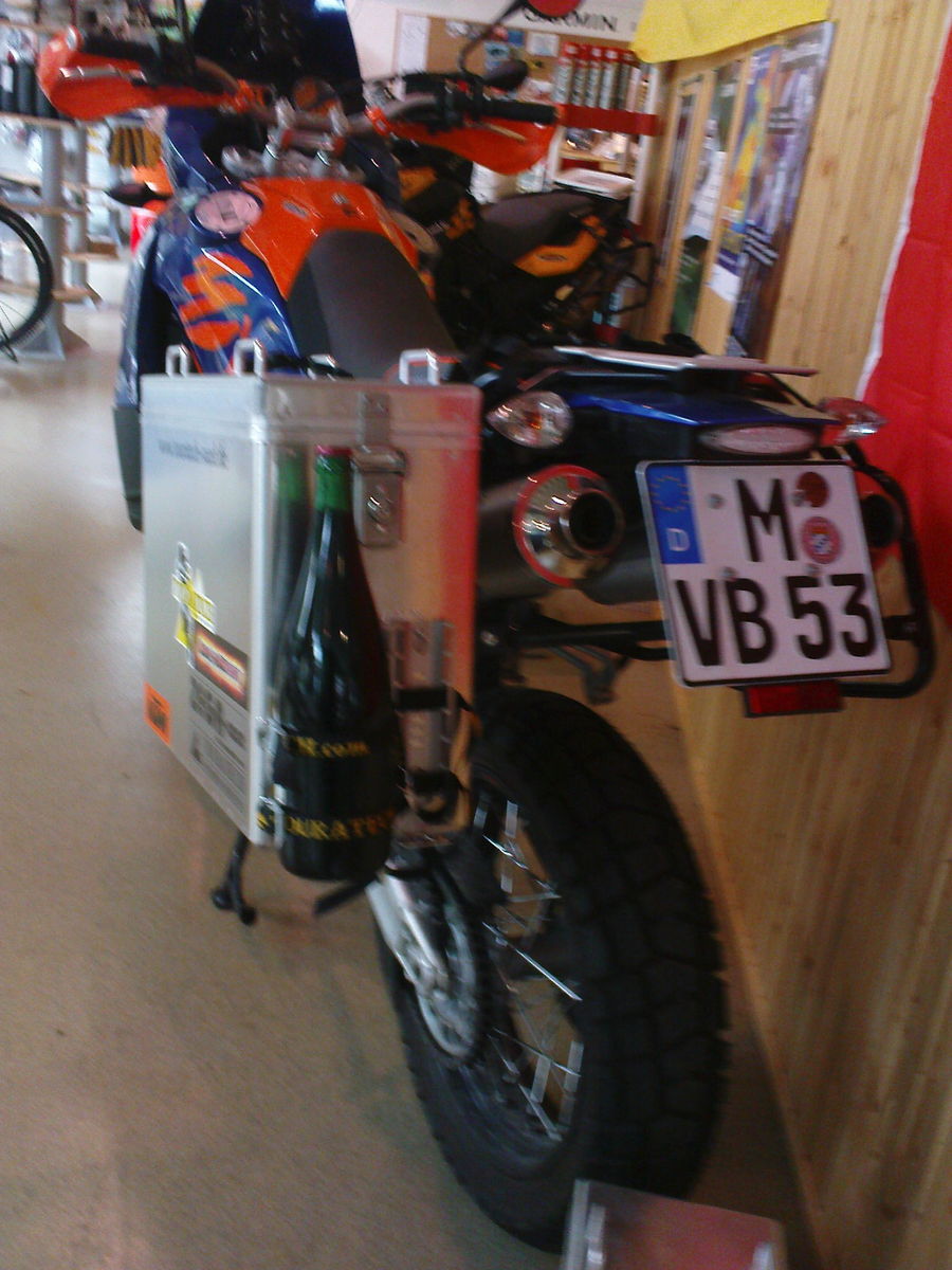 Jetzt weiss ich endlich, warum man sich zusätzliche Flaschenhalterungen an die Alukoffer von Touratech schrauben kann.