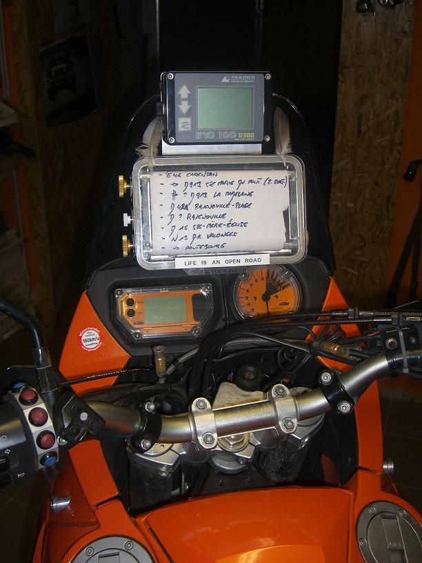 -Roadbookhalter auch (obwohl der MD-Roadbookhalter meiner alten 660'er Rallye um Welten besser war, bis auf das eine Detail, dass der Lenker bei vollem Einschlag nach links immer gegen den aussenliegenden Motor angeschlagen ist)