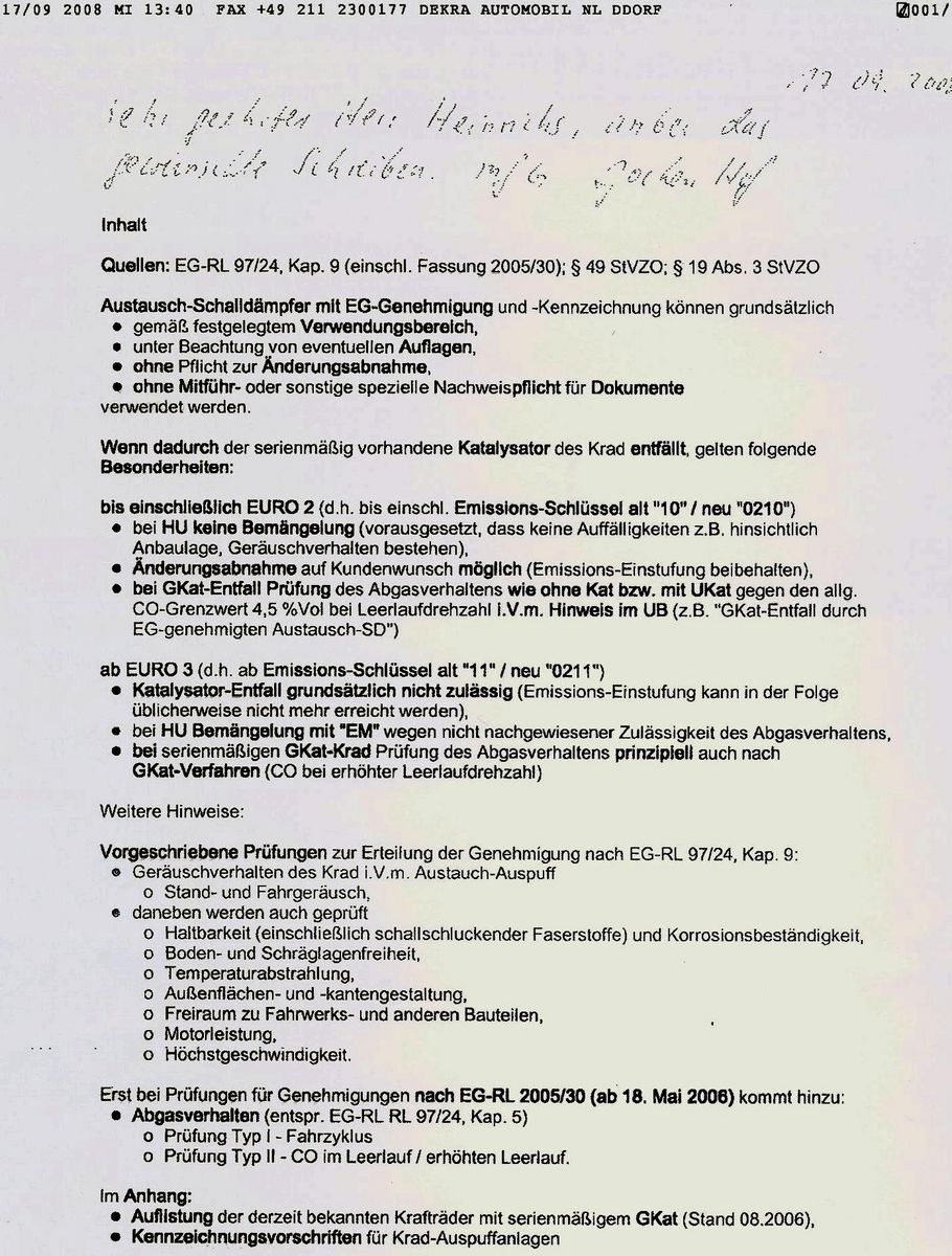 Seit diesem Jahr herrscht Verunsicherung darüber, ob Nachrüstanlagen einen Katalysator aufweisen müssen, wenn auch das Serienmodell einen besitzt. Schließlich müssen Motorräder ab Baujahr 1989 neuerdings alle zwei Jahre zu einer Abgasuntersuchung (AUK) – gewerblich genutzte Fahrzeuge sogar einmal im Jahr. Die Lage ist vertrackt. Alle ab 2006 nach Euro 3 homologierten Motorräder, die serienmäßig einen Kat besitzen, dürfen nur auf einen Nachrüstdämpfer mit Kat umgerüstet werden. Andernfalls bekommen sie bei der AUK wahrscheinlich Probleme mit den Abgasgrenzwerten.