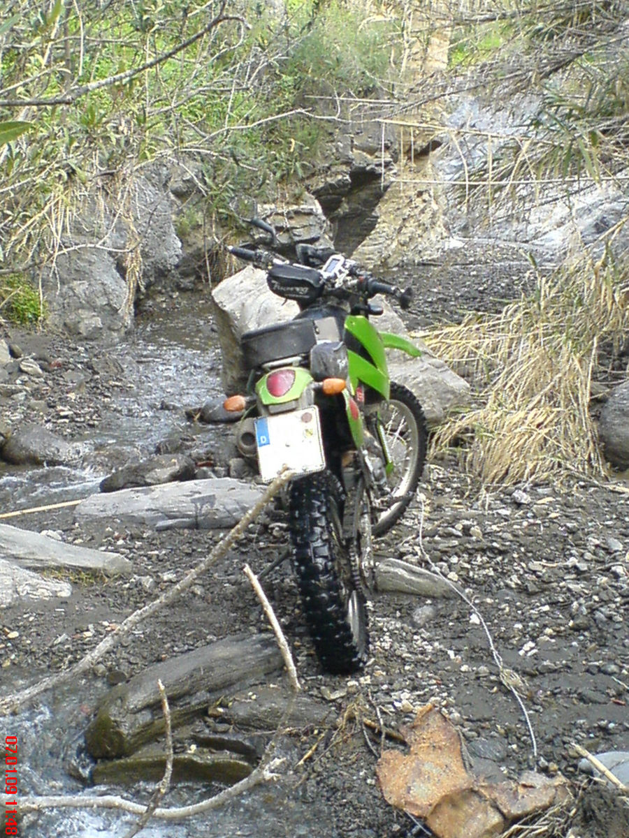den meisten fahrerischen Spass, neben den genialen Landschaften, machte mir im 3./4. Gang voll Stoff kilometerlang durch ein mittelgrobes breites Flußbett zu blasen und das Auge muß sich ständig den Weg suchen und auf Müll und große Brocken und zu tiefe Durchfahrten höllisch aufpassen. Dabei ständig das Rinnsal kreuzen und das Anheben des Vorderrades auf losem Untergrund üben und das Wasser spritzen und den Kies fliegen zu lassen Very Happy