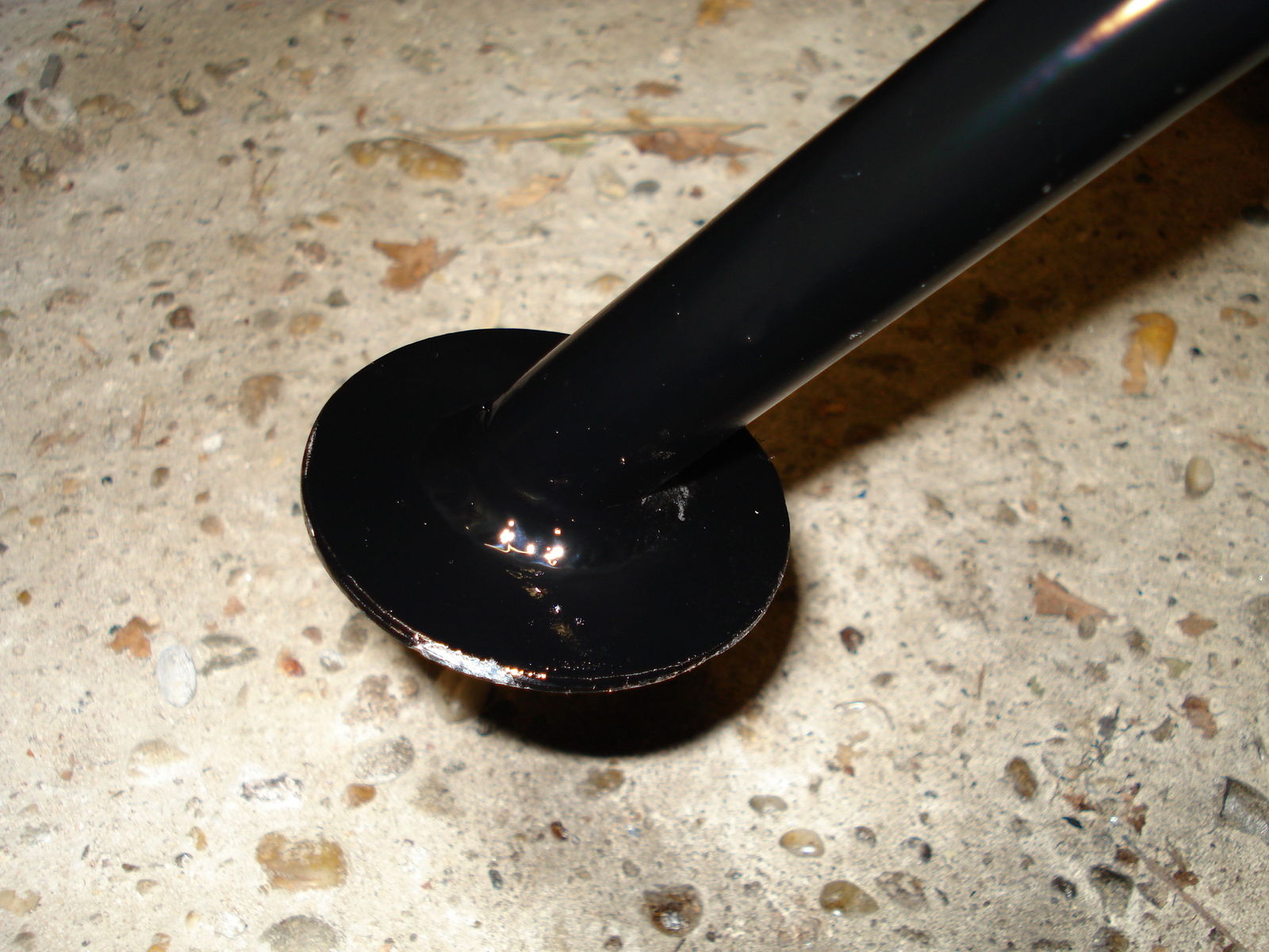 Du brauchst dafür nur zwei große Unterlegscheiben aus Stahl. Die eine muß innen genau den Durchmesser des originalen Ständerfußes haben, die andere etwas kleiner im Innendurchmesser. Dann noch eine Grundplatte (bei mir hab ich ein Stück Riffelblech zurechtgesägt), und dann brauchst du die drei Teile nur noch anbohren und mit drei Schrauben oder Nieten zu verbinden. Feddisch!
