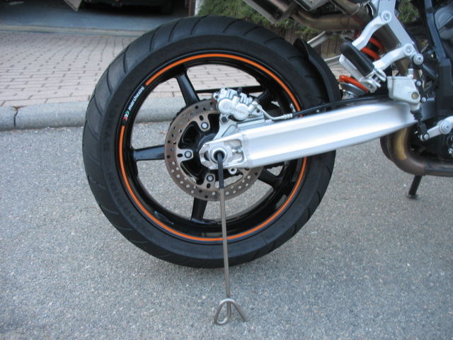 bei der alten LC4 gehts prima: übern Seitenständer kippen - rechtes Knie und linke Hand halten, linker Fuß dreht am Hinterreifen - rechte Hand sprüht Razz