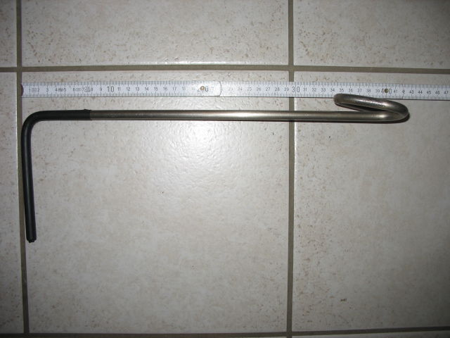 Hab das Teil jetzt nachgebaut. Hab mir vom örtlichen Landmaschinenmechi 60cm von einer Stange abschneiden lassen (2,40 €), zweimal um 90 Grad gebogen (einmal 15cm, einmal noch etwa 4cm parallel zum Motorrad) und funktioniert einwandfrei. Danke nochmals für die Idee. Wink