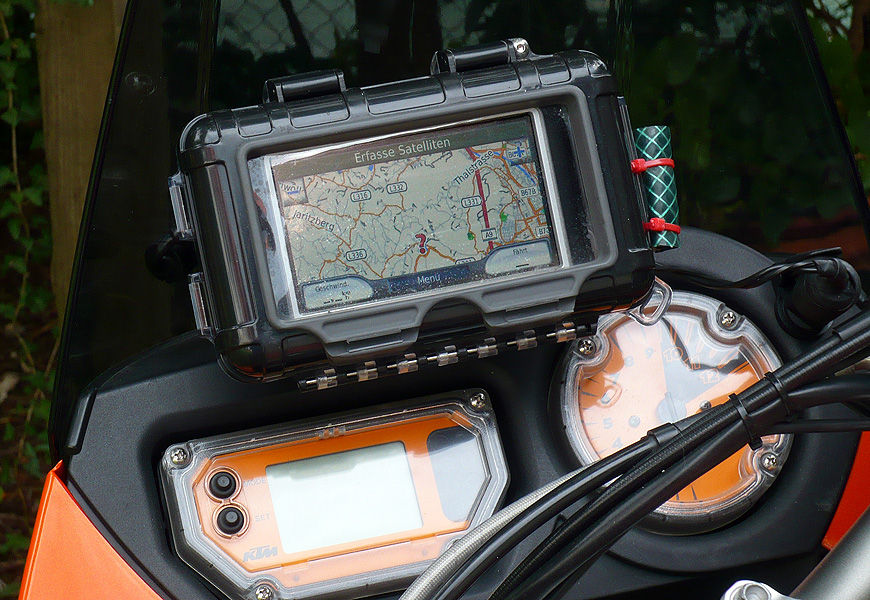 Ich hab mir die Navihalterung von KTM/Touratech geholt, ein Palmcase (ca € 50) in der richtigen Größe, und hab zwei kleine Alublöcke zu einem Klemmblock umgebaut.