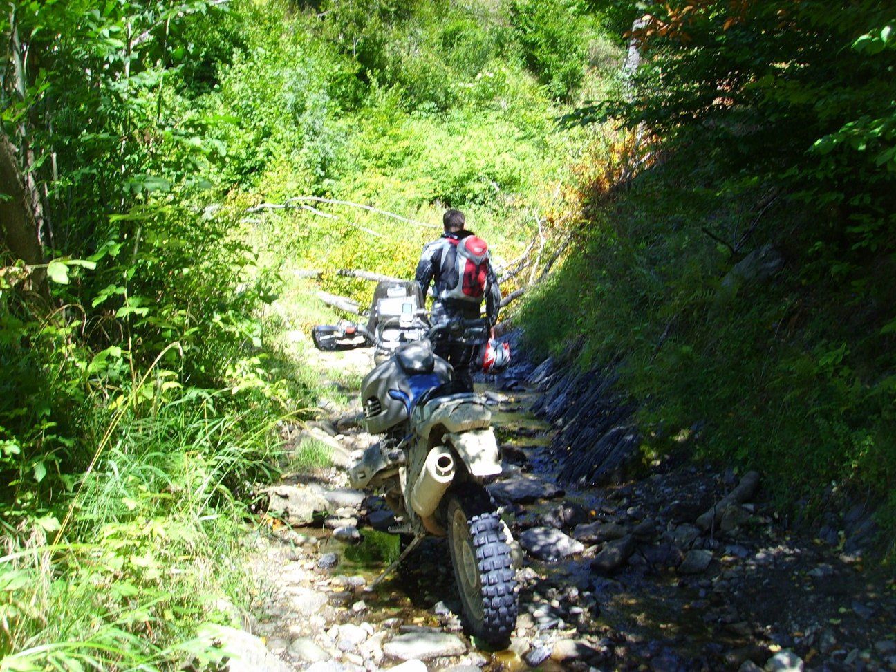 Anbei ein Bild im Flussbett. Das zweite zeigt mein Mopped beim kurzen Stop (Verschnaufpause) vor einer Auffahrt
