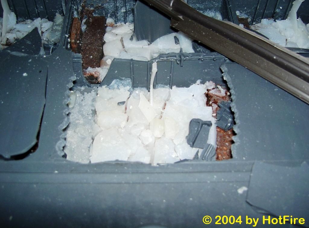 An dieser explodierten hinteren Geelbatterie war nur der aufgeklebte Temperatursensor runter gefallen und das Geelakkuladegerät "dachte" die Batterie hat nur 18°C und wird wohl ehr so 40°C gehabt haben: