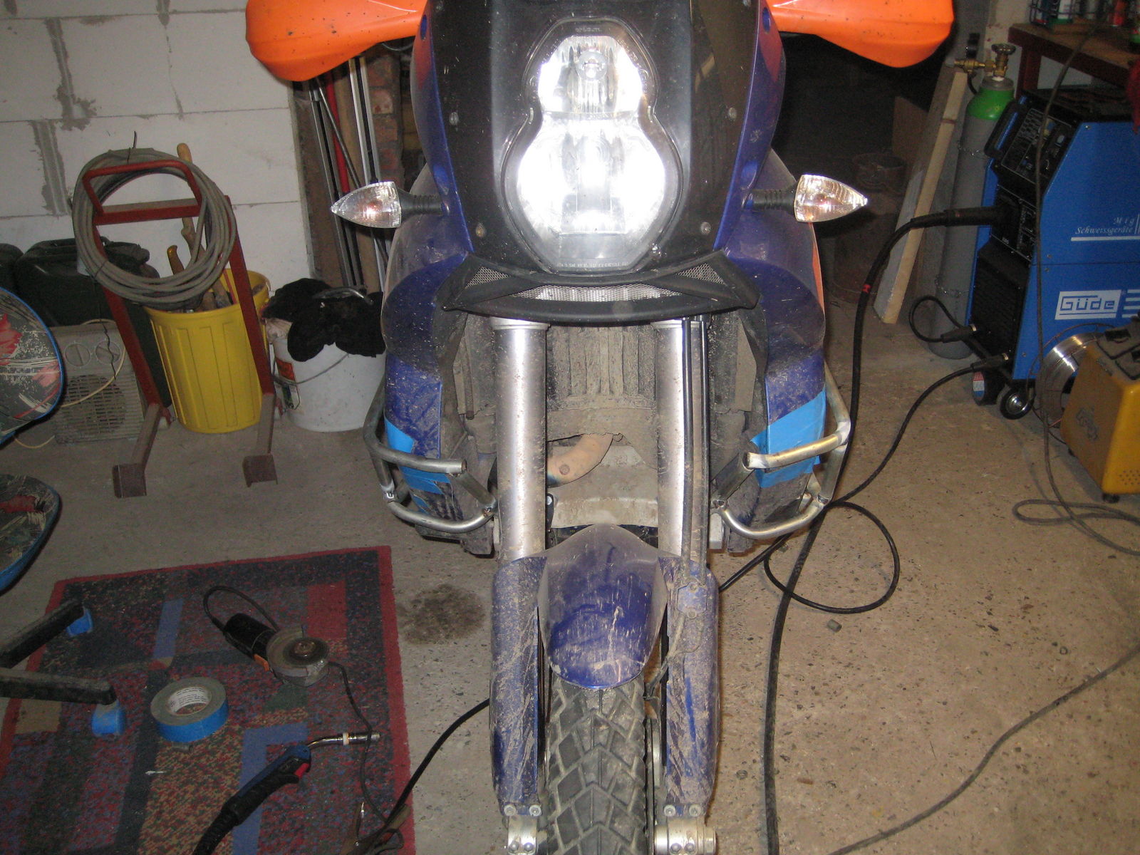 Wo Du doch gerade noch beim Schweißen bist, wäre es die Gelegenheit, ein Netz in die Bügel zu heften. Aufgewirbelte Steine und sonstiger Dreck fliegen dann nicht direkt durch bis auf den Tank.