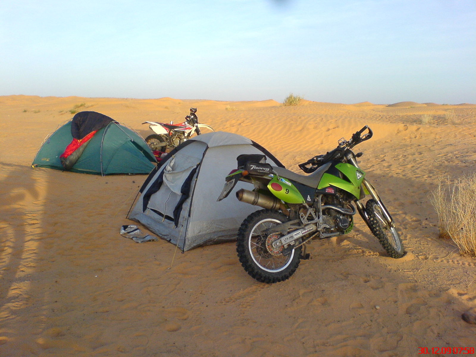 Mein Zelt auf- und abbauen klappt gut, Wir erreichen Ghilane, eine ziemlich große Oase, gegen Mittag und gehen in dem berühmten See baden, ziemlich viel los vor dem Jahreswechsel, und essen was. Der Freddy hat aber nich vor hier zu campieren, er will Silvester am Tembaine sein. So brechen wir etwas hektisch auf, ich schnappe noch schnell Koordinaten und Cafe Bebane auf, ein Wüstencafe, was auch immer das is. Jetzt kommen gleich heftige Dünen, der Sand trägt am Nachmittag gar nich mehr. Von Piste nichts zu sehen. Die zwei besten Motorradfahrer fahren vor, ich bin hinter den LKWs, die fahren einen komplett anderen Rhythmus, hinterherfahren geht gar nicht, ohne die Kupplung zu ruinieren. Einfach überholen und denen im Weg rumfahren geht auch nicht, also versuche ich 2-3 Dünen entfernt, rechts vorbei zukommen. Das geht schief, ich grabe mich an einer ganz ungünstigen Stelle ein, brauche eine Viertelstunde bis ich wieder vorwärts komme, jetzt ist keiner mehr in Sichtweite. Ich versuche die Route zu schneiden und schnell zu dem Motorradfahrern aufzuschliessen. Ich erreiche sie aber nicht, und beschließe, nun wieder auf die LKWs zu warten, die haben aber inzwischen eine andere Route eingeschlagen und sind nochmal zum alten Fort hochgefahren. Ich begreife langsam, dass ich jetzt alleine in der Wüste stehe. Meine Panikattake unterdrücke ich mit dem rationalen Gedanken, dass ich ja grad getankt und die Wasserblase aufgefüllt habe. Ich rauche hektisch und überlege: zurück nach Ghilane, wo die Anderen ja definitiv nicht sind oder allein weiter zu diesem Cafe. Arabische Jeeps kommen vorbei und erkundigen sich, ob alles in Ordnung ist, ich weiß nicht so richtig was ich sagen soll. Ich fahre zu dem Wegpunkt, den ich habe, per Luftlinie, die Strecke geht jetzt halbwegs, teilweise ist Piste erkennbar und jetzt kommts dick, der Punkt ist mitten in der Pampa, nix Cafe, nix die Anderen. Kein Netz. Ich warte an dem Punkt, mir wirds jetzt anders, nicht mehr lange bis zum Sonnenuntergang. Es halten mal wieder welche, ich frage,wo hier das nächste Cafe ist, 25 km Richtung Douz ist die Antwort, hm prima. Ich forste mein Oregon durch und entdecke ein Bierkrugsymbol auf der Tunesienkarte, nicht weit. Jetzt kommt eine Gruppe schweizer Enduristen in der richtigen Richtung, ich entschließe mich, bei denen mitzufahren, schaffe es aber nicht, weil die Karre wieder etwas muckert (übrigens das letzte mal, ab da lief sie ohne einen Aussetzer) Jedenfalls komme ich zu einer Strohhütte mit Bettenlager, die Schweizer fahren weiter. Ich entdecke ein Schild Cafe Grand Erg. Hm ich denke, gerettet, aber falsch hier. Der Besitzer, ein netter Araber, bemerkt meine Sorge und gibt mir erstmal einen Tee. Nach einigem Gespräch bekomme ich heraus, dass dies das Cafe Bebane ist, auf arabisch. Der muß denken, dass ich nich ganz dicht bin, weil ich mir das noch mind. 15 x bestätigen lasse. Es dauert etwas, da kommen unsere 2 Motorradfahrer und später der ganze Troß. Ein Stein fällt vom Herzen. Ich erfahre später, dass die Koordinaten aus dem GoogleEarth stammten und somit eine Abweichung in sich trugen, anderes System. Der Schock sass. Nachtlagerunweit vom Cafe.