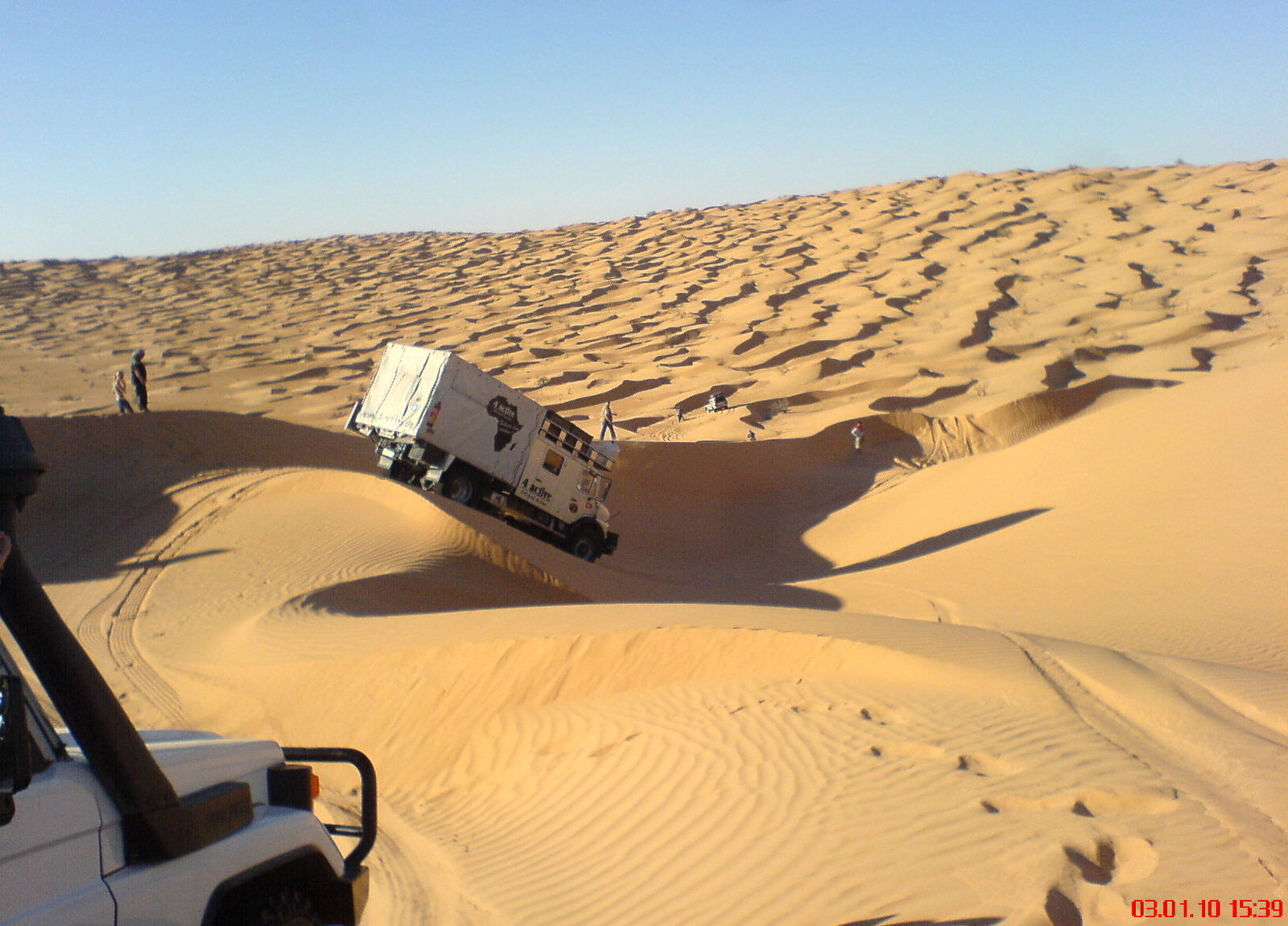 Ich gehe je nach Gefühl mal eher schlafen mal sizte ich bis nach Mitternacht am Lagerfeuer. Ich schlafe meist gut und plage mich nur etwas mit dem zuvielen Gepäck rum, man brauch hier wirklich nich viel. Früh gehts meistens so um 9 raus und gegen 11 ist dann Abfahrt. Tagsüber gibts immer eine große Picknickpause und die Bikes werden aus den Kanistern betankt. Alles ist da, man muß sich aber um sich selbst kümmern, man bekommt nichts hinterhergetragen, z.B. Luftdruck, Öl, Wasser, Isotrink, Riegel, die man hier auch wirklich braucht. In der Regel läuft alles ziemlich schnell, aber gut organisiert ab und mit der Zeit kommt man rein und es geht alles schneller, so dass sich auch individuelle Freiräume ergeben, z. B. mal ne Stunde einfach nur so in die Dünen liegen oder Tagebuch schreiben, es ist ja alles so interessent und anders als man es von zu hause gewohnt ist und zelten war ich auch schon lange nich mehr. Den anderen Fahrzeugen mitzuhelfen oder auch mal zuzuschauen, wie man mit der Winde arbeitet und einen vergrabenen Landcruiser befreit.
