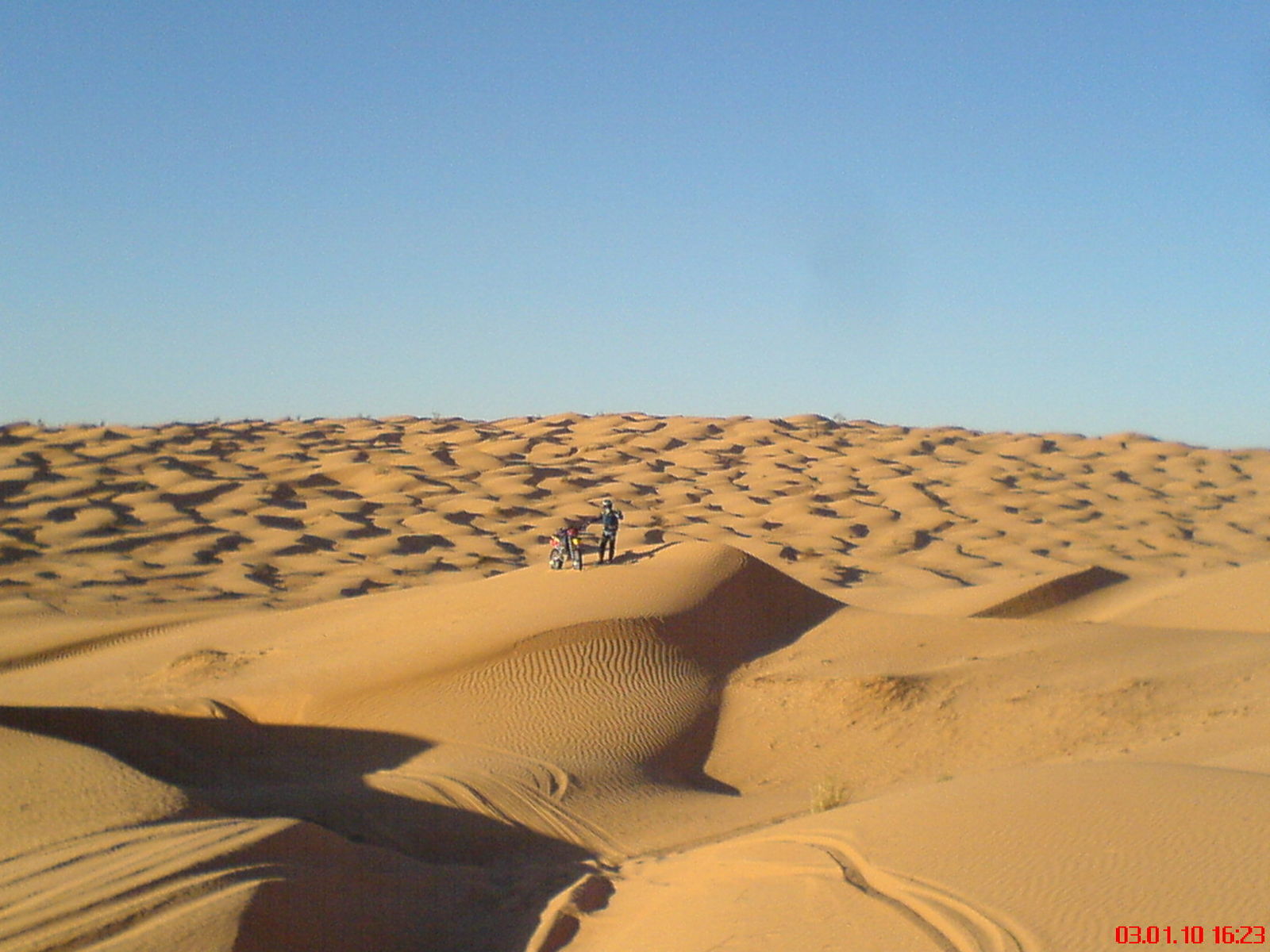 bemerkenswert fand ich zwei Sachen, wo ich mich im Kopf umstellen musste: Zum einen bin ich gewohnt auf Wegen zu fahren und habe anfangs ständig den Weg gesucht, mich hats immer zu den Anderen hingezogen, weil ich dachte da ist der Weg. In der freien Wüste muß man sich aber seinen Weg selber suchen, Spuren können je nach Windlage auch ganz schnell wieder verschwinden. Anfangs hab ich mich an den Spuren der Sportis orientiert, das ging aber auch nich so, weil die gleich auf den höhsten Dünenkämmen rumgeturnt sind. Dafür reichten meine Kräfte höhstens einmal am Tag. Sobald es keine festen Flächen mehr im Untergrund, sondern nur noch Eieruhrsand gibt, ist es auch vorbei mit durchmogeln und mal im Sitzen tuckern.