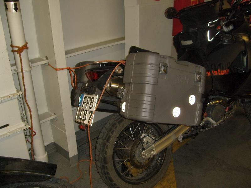 Wenn die Möglichkeit besteht, das Mopped immer mit dem Seitenständer zur Schiffswand stellen. Zwischen Koffer und Wand den Rückenprotektor einklemmen, oder ersatzweise ein festes Stück Pappe etc. SEILE SELBER MITNEHMEN....iss nicht gesagt das in der Garage welche zu finden sind. SELBER DAFÜR SORGEN DAS MOPPED GUT VERZURRT IST.....NICHT AUF DAS PERSONAL VERLASSEN!!!!!!! UND WENN: daneben stehen bleiben und zusehen. Die binden die Seile an Seilzüge und sonst wohin (oft!), die übelsten Sachen schon gesehen, wobei das Personal noch um einiges besser ist von ITA nach GR als innergriechisch...da isses ne Katastrophe.