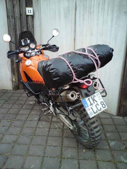 Meine variante hat zwar nichts mit "sichern" im Sinne gegen Diebstahl zu tun sondern mit befestigen.Da ich meistens nur mit Gepäckrollen und das nicht bei jedem beliebten "Topfkäs" unterwegs bin,hab ich mir eine Möglichkeit zum befestigen und verzurren der Rollen gebaut.In Verbindung mit den Rockstraps hat man diese Ruckzuck an bzw. abgerödelt.