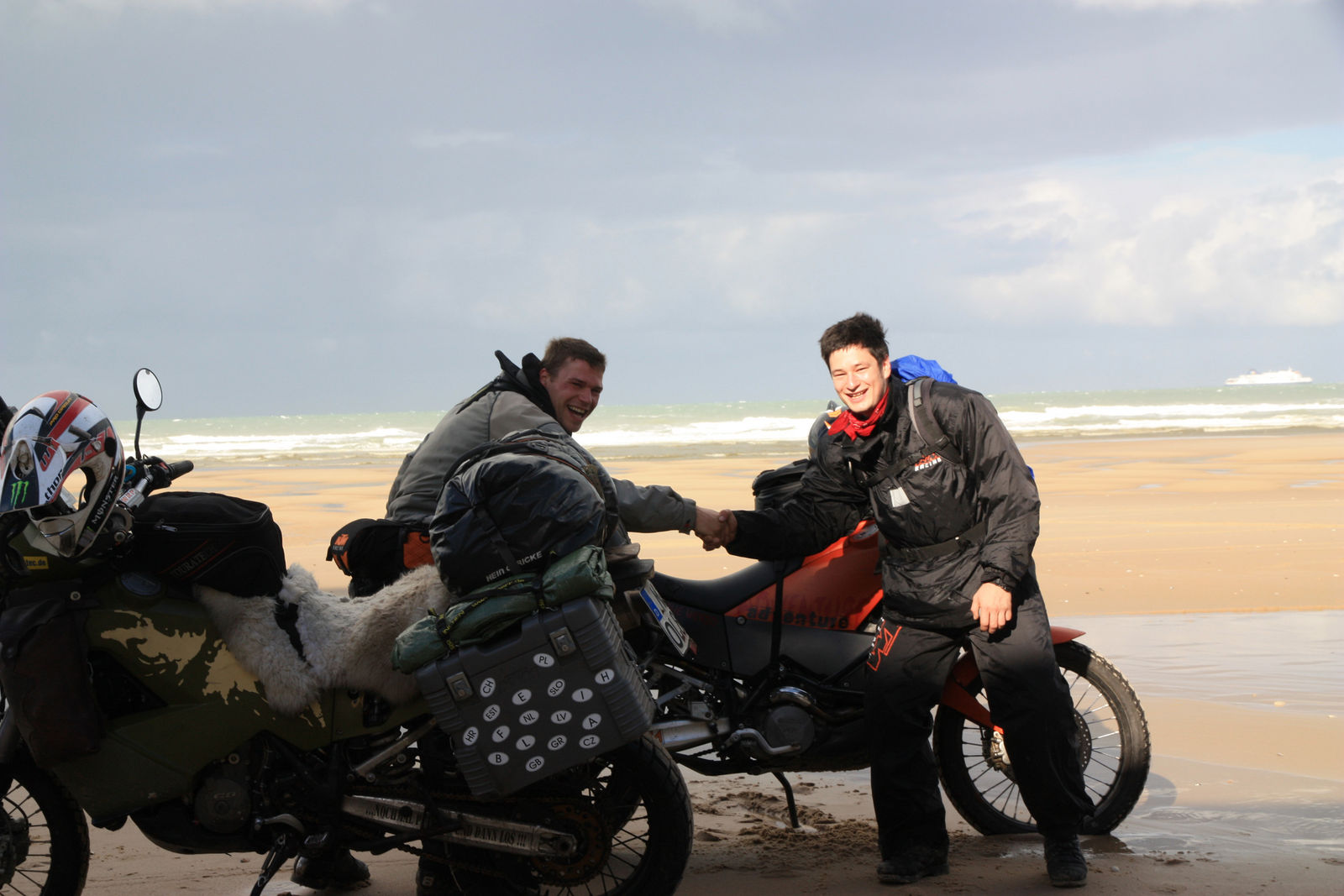 Kurz vor Ostende, der Ort an dem unsere Fähre fährt, wir sind auf der Outobahn (oder einen fetten Bundesstraße). Eine rote Ampel – wir stellen uns auf ein Beschleunigungsrennen ein. Ich stehe vorne, Ampel springt auf grün, ich ziehe los – die anderen nicht – verdutzt werfe ich einen kurzen Blick nach hinten. Im Blickwinkel sehe ich ein Blau Weißes Motorrad mit Rundumleuchte. Heinz startet los, einige Meter auf dem Hinterrad. Au Mann, er hat den Beamten nicht gesehen. Atzimuth und ich fahren langsam hinterher, unsere Blicke sagen das gleiche „er wird gef**kt“.