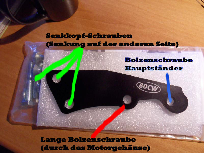 Der Blackdock (und damit der drauf angeschraubte Seitenständer) hat an den vorderen Schrauben (Senkkopf in den Körper des BD) keine Verbindung mehr zum Motor-Gehäuse. Ist "nur" noch durch eine megalange, fette Bolzenschraube durch die gesamte Breite des Motorgehäuses und direkt an der linken Hauptständer-Befestigung mit einer Bolzenschraube mit dem Bike verbunden, das aber genauso stabil wie vorher, so wie ich das mal subjektiv beurteilen kann. Also.......schaun ma mal! Smile