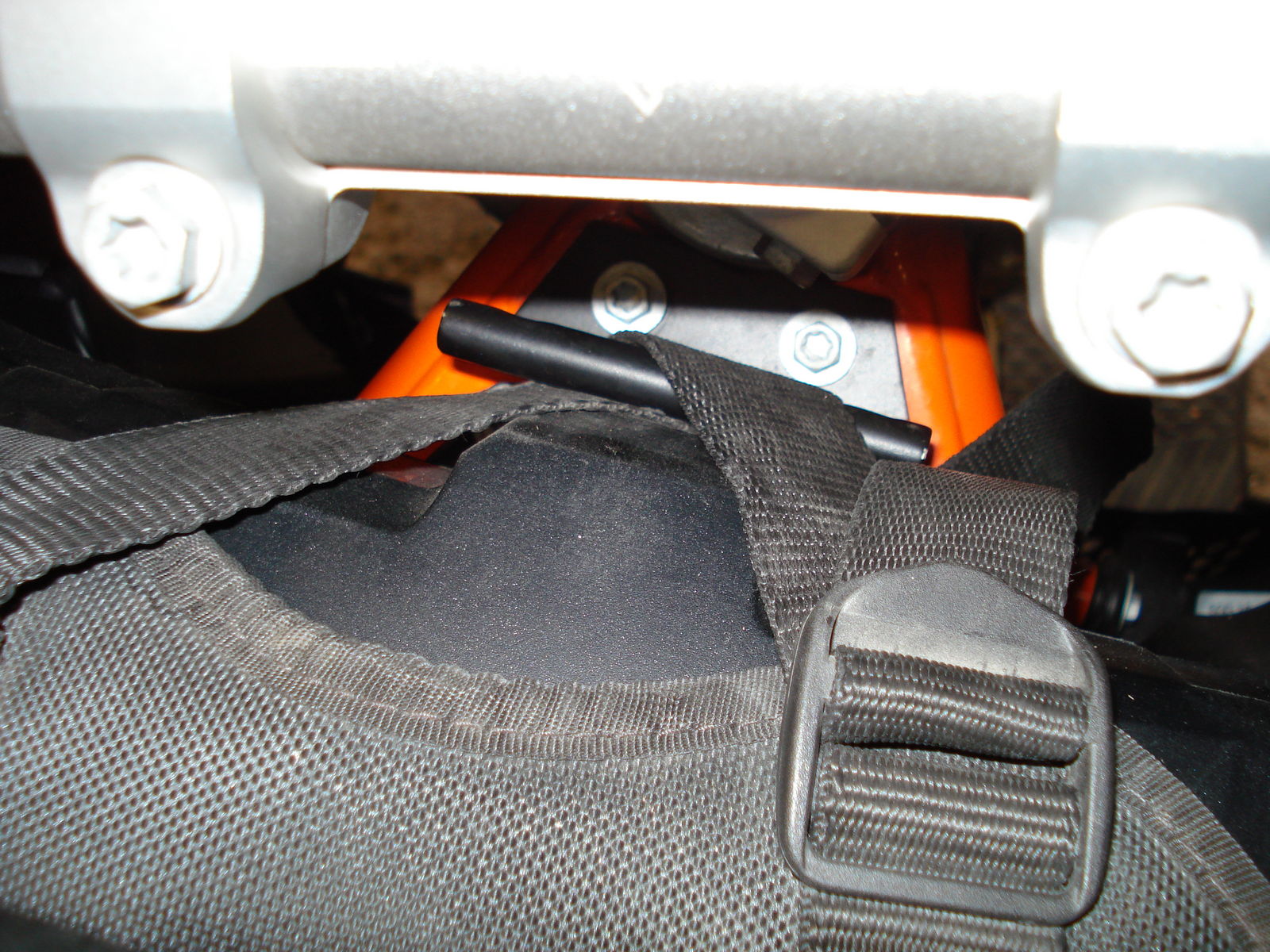 Für die untere Befestigung hab ich mir zwei Buchsen gedreht, die in die originalen Buchsen reinpassen (ist das bei TT auch so?) Der Tankrucksack ist dann einfach mit starken O-Ringen eingehängt.