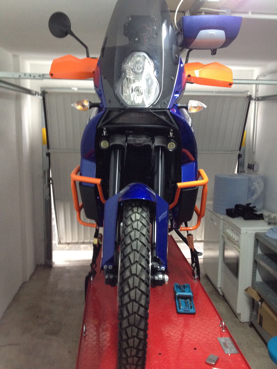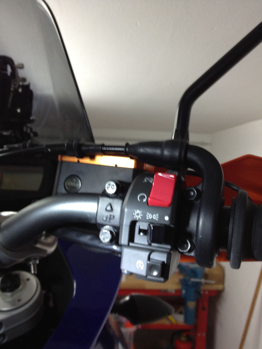 Der Anbau lässt sich in 30 Minuten erledigen (Hamsterbacken und Scheinwerfer raus). Die Besonderheit bei den Dingern: An der Rückseite der Scheinwerfer ist ein blauer Gummiknopf. Mit diesem lässt sich die LED-Funzel in drei Stärken dimmen oder ganz abschalten (zum TÜV???). Der neue Schlater am Lenker bietet drei Schaltstufen: