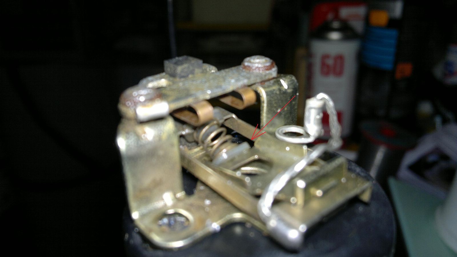 Was ich feststellen konnte: Die Feder mit den weissen Plastikplätchen funktionierte nicht mehr! Durchs festkleben der Kontakte floss längere Zeit ein hoher Strom, es rauchte richtig am Kontakt(Kontakspray suchte da wohl das Weite). Somit wars da richtig heiss, die Metallbügel konnten nicht berührt werden somit über 70 Grad. Darum schmolzen auch die Plätchen an der Feder leicht an(nur Plastik). Nun war das leicht Wippen nicht mehr möglich, somit Totalausfall. Mad