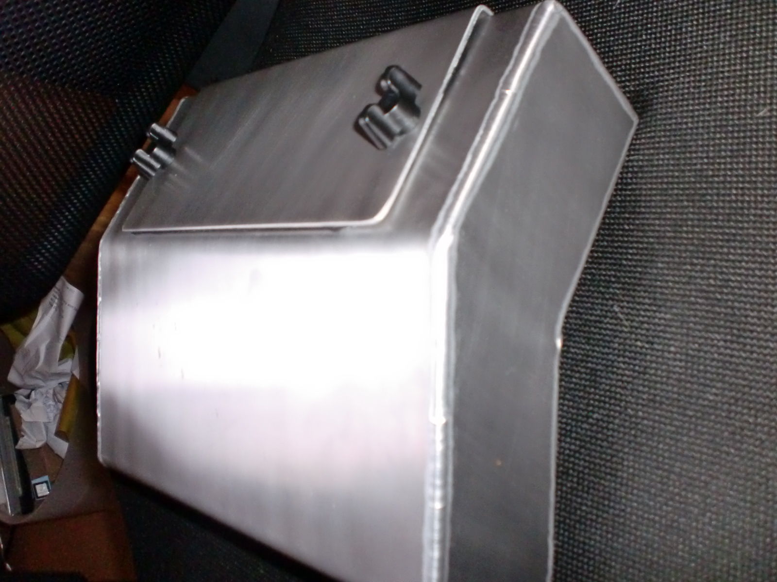 am ehesten wirds wohl so ein Abwasserrohr, durchmesser 7,5-10cm und länge 30cm, dann links rechts 2 deckel, gummidichtung und noch irgendwie verschrauben, dann mit zwei schellen unten an den Batteriekasten ran :-)