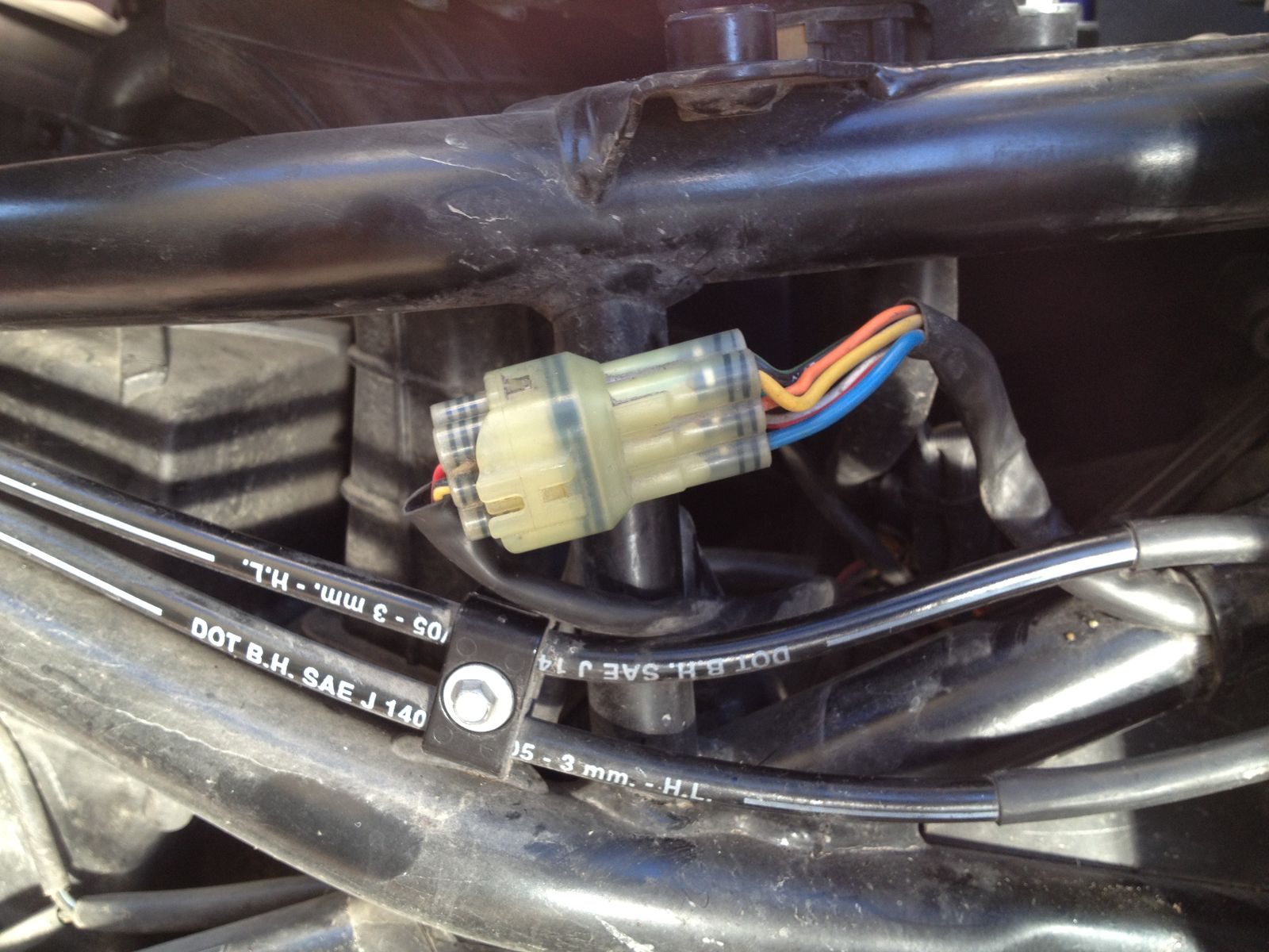 Wie auf den Bildern erkennbar liegt ein Wackelkontakt im Kabelbäumchen vom Zündschloss ausgehend. Da wo der Finger drauf zeigt kann man es etwas knicken, dann geht Licht an oder aus ect. Also bis zur Steckverbindung freigelegt und Lenker in verschiedene Posi gedreht. Erfolg gleich 0.Mal geht es, mal nicht.