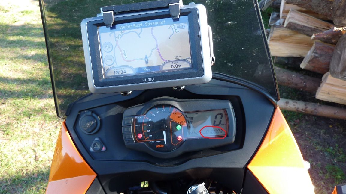 Schon beim Wegfahren zuhause wusste ich - heute ist ein magischer Tag, ein wichtiger Tag, dend der km-Zähler stand bei Neuntausend-Siebenhundert-irgendwas. Doch lieblich Herbstsonne, Blätter in allen Farbnuancen (stimmt nit: kane weissn gsegn, a kani schworzen! Ausdruckfehler!) rückten die Aufmerksamkeit vollends auf sich, sodass mir das Zehn-Tausender-Jubiläum knapp [400] entging. 3 km weiter und im selbigen Augenblick vollends ausrastend, bemerkte ich diesen Umstand und warf den Anker, womit gesagt sei, dass ich erstmals das Kantn-ABS vorne regeln spürte, auch mal eine Erfahrung - somit könnte man dem Augenblick durchaus auch etwas positiv abgewinnen - dennoch das Jubiläum verpasst! oiso drauf gsch... auf so a ABS-Erfoahrung! (Abschweifung die 3.e !).