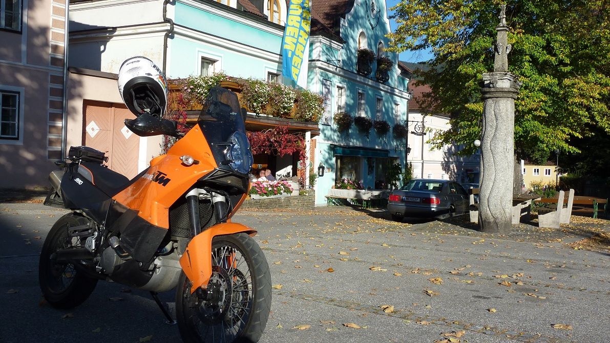 Letztes Wochenende war wettermäßig ja eine Wucht - dies war auch der Sozia nicht entgangen. Des Hausfriedens wegen opferte ich den Samstag für einen gemeinsamen Ausflug mit den reduziert beliebten 4 Rädern zwecks Besichtigung von 2 Burgen, was im Grunde auch nicht so minder war. Sonntags jedoch kam mir während dem frühmorgendlichen Kaffee-plus-2-Tschick Ritual der abwegige Gedanke, diesen herrlichen Herbsttag auf jeden Fall mit der Orangenen zu verbringen, welch selben Entschluss ich kurzerhand und bereits in den Klamotten steckend in die Wohnung brüllte. So packte [100] ich auch die seit fast 2 Jahren nicht mehr benutzte Lumix TZ7, ob des handlichen Ausmaßes ideal fürs Beautycase, und befreite die Kantn aus ihrer Wipark-Großstadtgarage in einer Tschicklänge Entfernung - wofür man als paranoider Erstjahresneumotororradbesitzer mtl. stolze 60 Teuronen hinlegt, nebst Alarmanlage und Teilkasko - deppert? Ja, wahrscheinlich - von November bis Feb/März wird sie in der Werkstatt eines Freundes überwintert, alles bei Wohlfühltemperatur (Abschweifung die 1.e !).