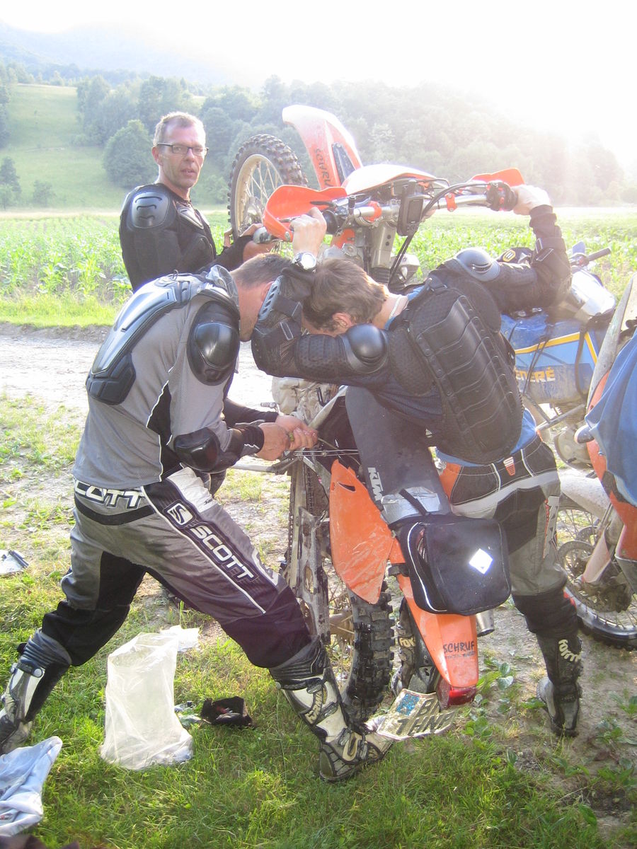 Wir machten uns zu Fuß auf die Suche nach Fahrer und Maschine um nochmals Kontakte zu trocknen etc. Eine heimelige Nacht- und Nebelfahrt im rumänischen Wald nach Brebu Nou folgte...um halb Eins rollten wir ein. Das ist ein Moment wo das ganze Enduromania-Backup aufgeht: Es gab noch warme Suppe und natürlich Bier, yeah!