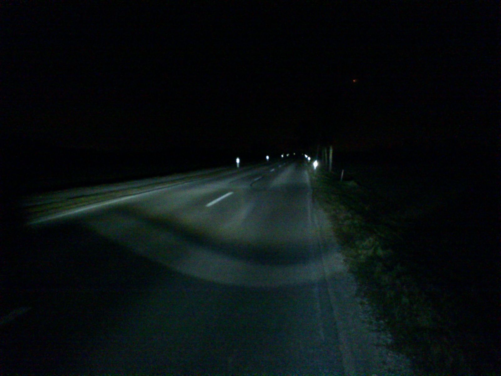 Mit dem Auge sieht man natürlich auch mehr in der Nacht als die Kamera im Handy einfangen kann. Die Reichweite wäre sogar mehr gewesen als die hier angestrahlten Leitpfosten, aber dann kam eine Kurve... (Und ich weiss ehrlicherweise auch nicht, ob sie an der Landstrasse tatsächlich im 50 m Abstand standen.)