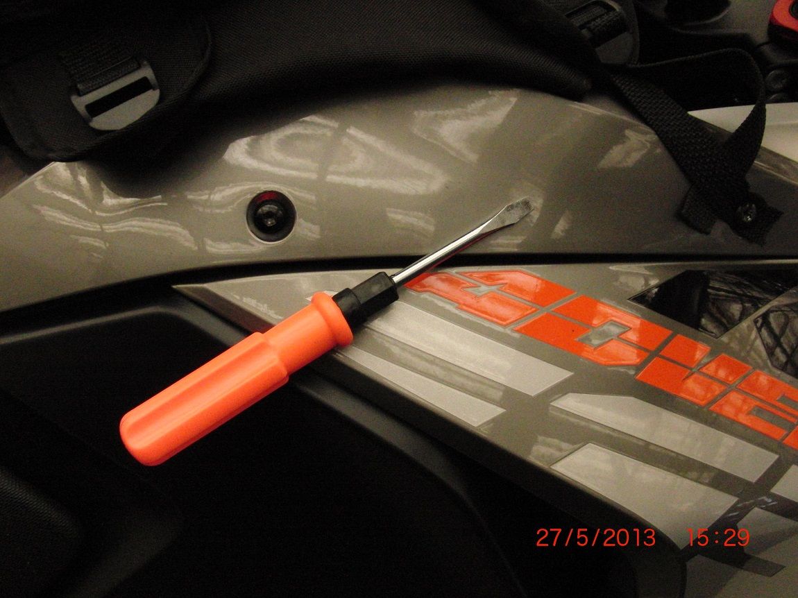 Die Vorkleidungsschrauben habe ich zur Befestigung der Riemen herbei genommen. Unter die Tankverkleidung habe ich dünne Magnete angeklebt. Hält auch bei Höchstgeschwindigkeiten und brauchte nicht schon wieder einen neuen T-sack kaufen.