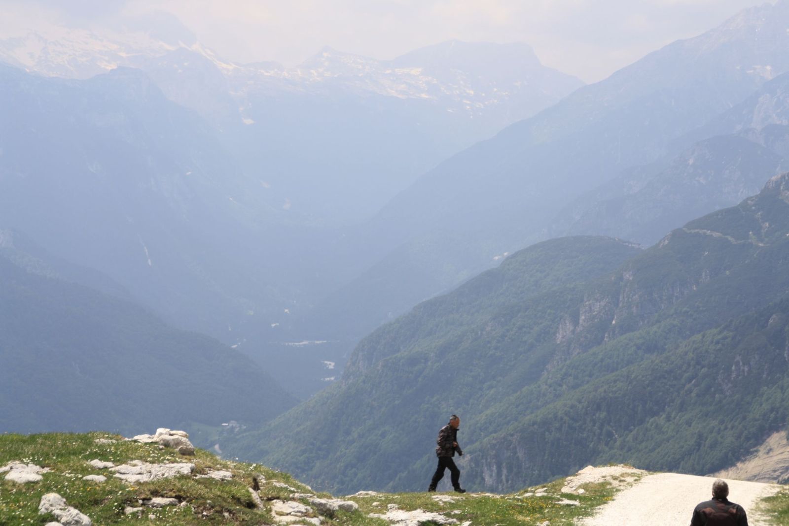 | Einer meiner Mitfahrer als Zwergengestalt vor den slowenischen Bergen, vom Mangart aus fotografiert |