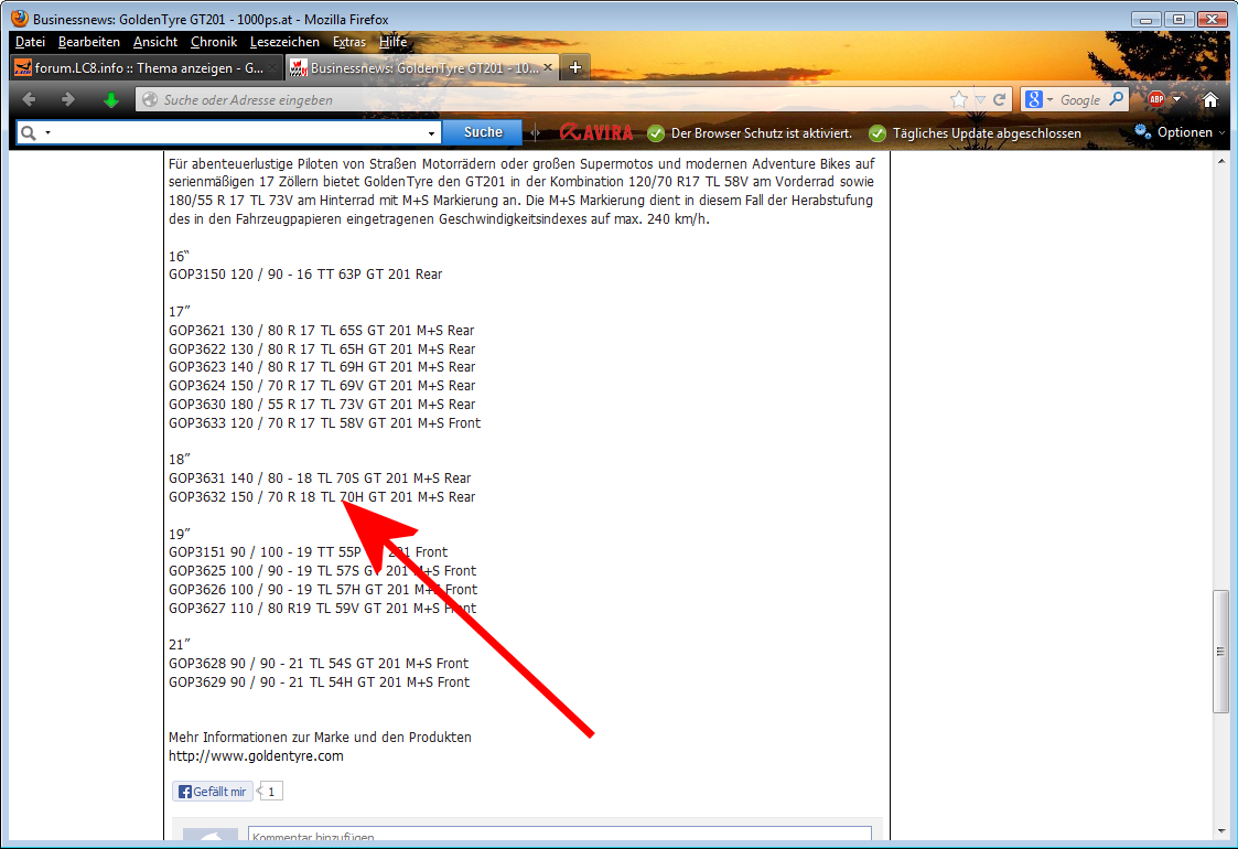 | pebo @ So, 20. Jul 2014, 20:07 hat folgendes geschrieben: | | pebo @ Mi, 16. Jul 2014, 8:43 hat folgendes geschrieben: | Bekomme morgen einen Satz GT 201 in 90/90-21 54H und 150/70R18 70H http://www.goldentyre.com/de/dt_portfolio/gt-201-enduro-onoff/ für 143,- EUR + Montage + neue 2mm Schläuche. Danach geht es gleich für einige Tage nach Süden zu flacher Rundkost und Saft aus Weintrauben.