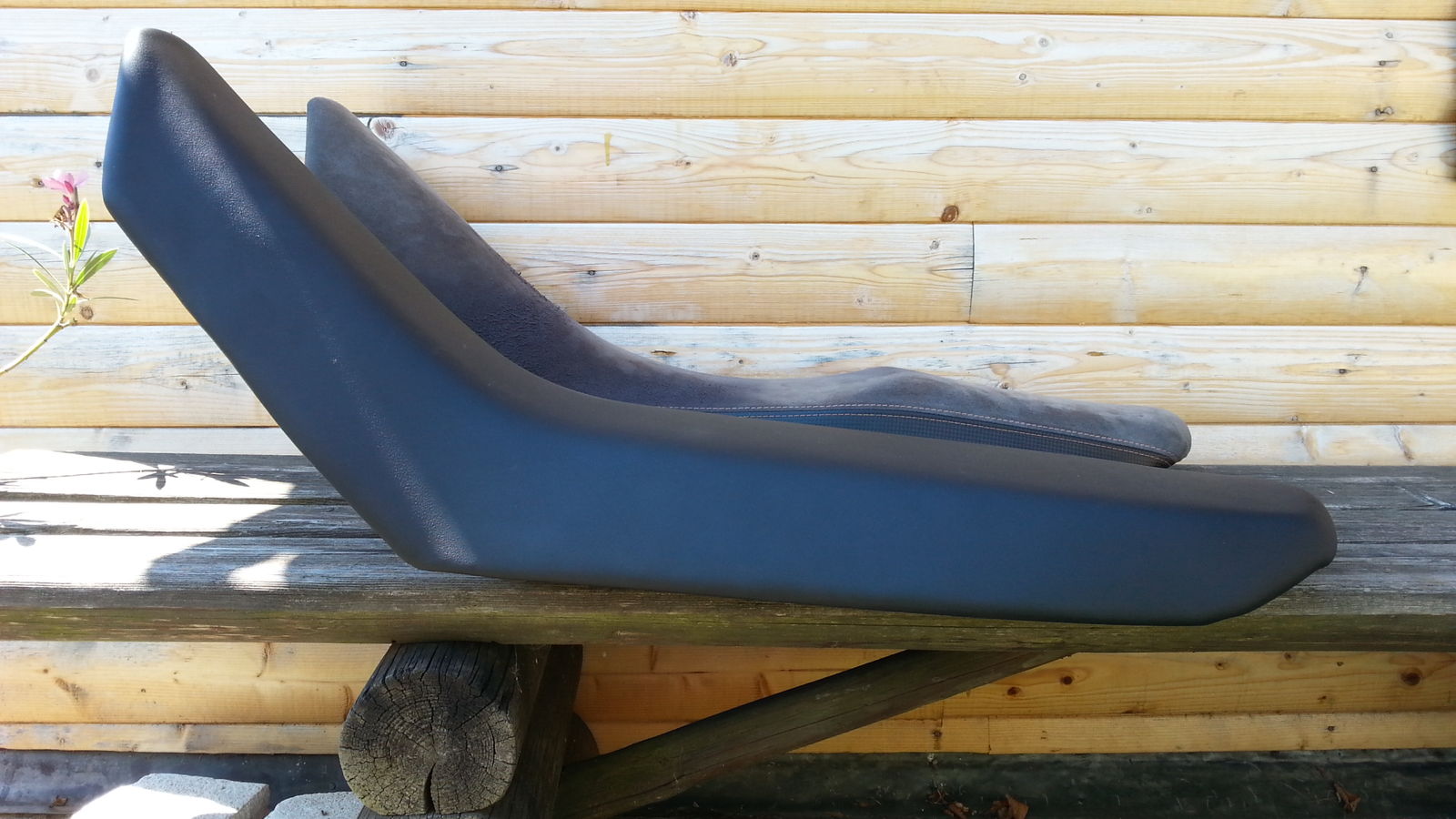 Mich hat es sehr genervt, das die Dakar Sitzbank immer klatschnass war und die Oberfläche so unschön wurde. Ich habe mir eine gerade Sitzbank bei ebay geschossen und zusammen mit der Dakarbank neu beziehen lassen. Die gerade nehme ich auf kürzeren Strecken und die mit Mulde zusammen mit air hawk auf Langstrecke.