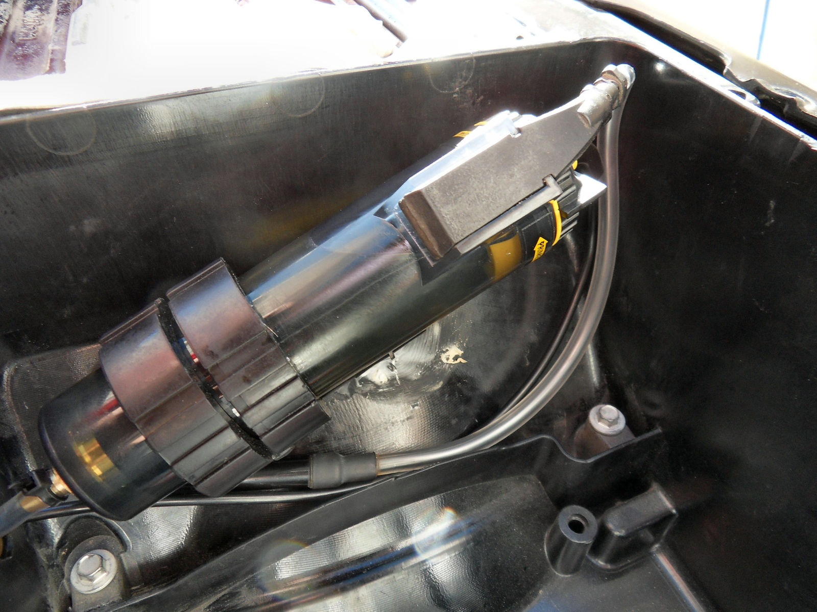 Die Arbeit dauert etwa eine Stunde. Die seitliche Bohrung für die Schlauch-Durchführung ist durch eine Plastik-Doppelwand.....also aufpassen das man nicht den drunter liegenden Heck-Rahmen anbohrt wacko !
