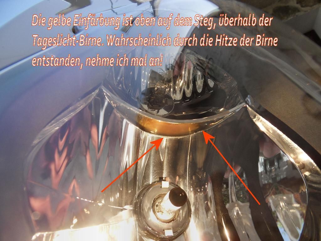 hab heute einen hohen kotflügel an meine @ gebastelt und dabei festgestellt das in meinem scheinwerfer irgend etwas gelb schimmert. hab dann geschaut wo das her kommt...naja, es ist der steg zwischen abblend- und fernlicht. dieser ist von unten gesehen gelb. ich würde mit meinem unwissen behaupten, das dieser steg eigentlich das licht, von der darunter sitzenden glühbirne, nach vorne unten ablenken soll?!? (abblendlicht)