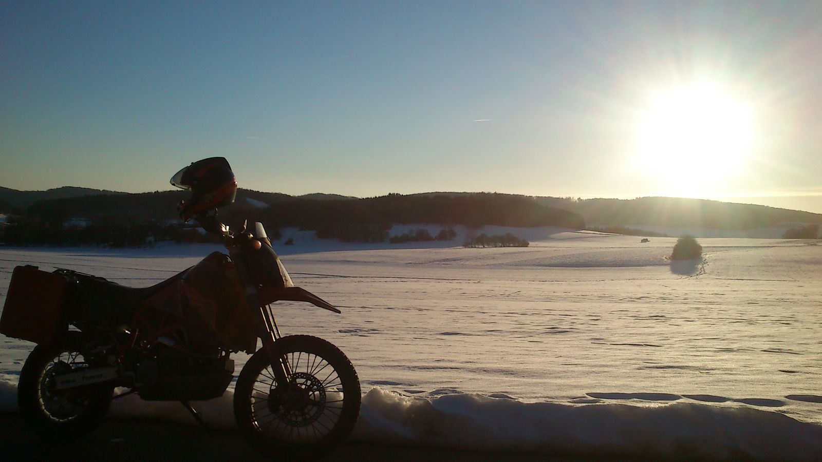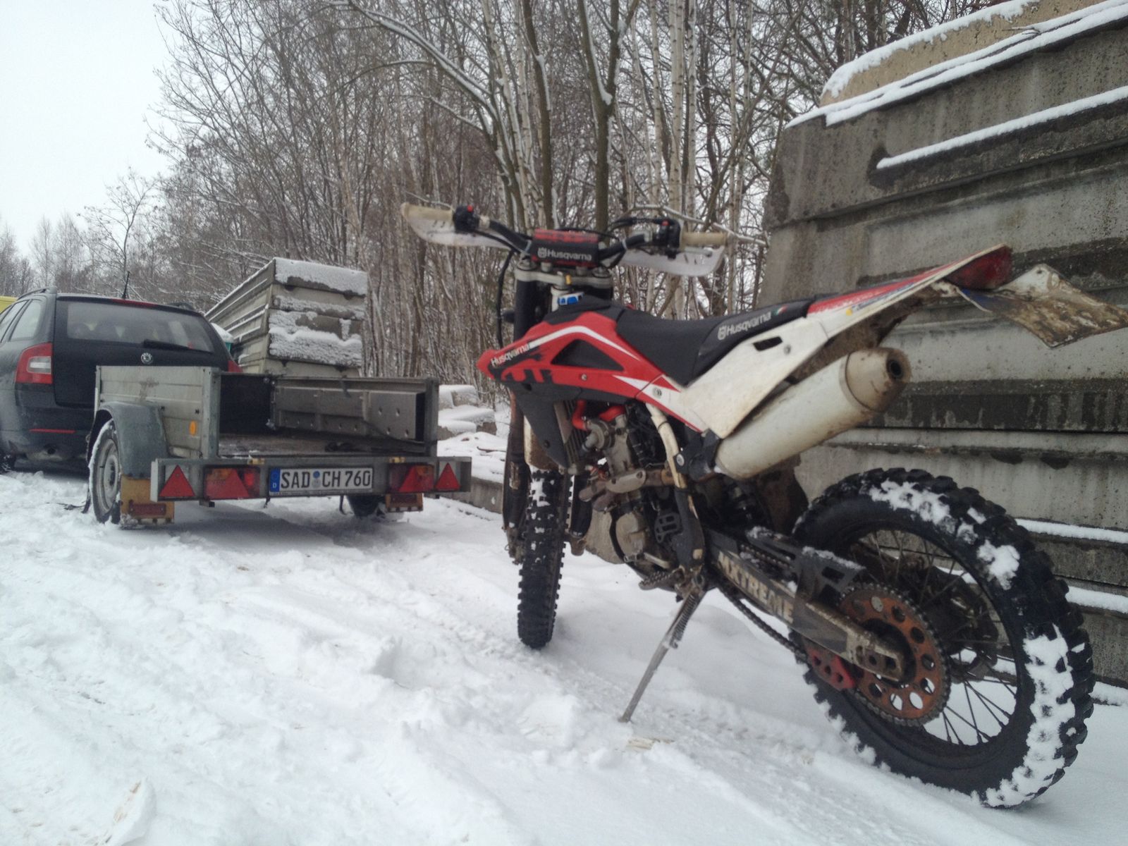 Am We wollte ich mal wieder lernen, wie man die kleine bewegt und hatte mich auch tierisch drauf gefreut auf die 8h knattern. Dass da bis 20cm Schnee lagen, hatte keiner gebucht und keiner gesagt. Ich dache ja, da es zuhause braun und trocken ist, reichen die knapp 50% Profil auf der Husky noch. Denkste, da war verdammt wenig halt am Hinterrad. Dafür wurds uns gut warm unter der Mütze!!! Gefroren hatte keiner!!!