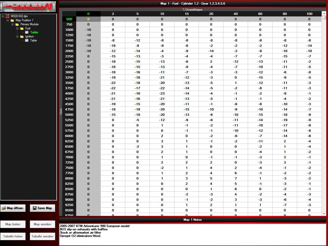 Das Mapping wurde auf der Dynojetseite für mein Moped (990er S, 2008, BOS-Pötte mit Schnüffelstück, Rest Serie) zum Download angeboten. Es ist allerdings im Format für den PC III USB. Da mit der Software des PCV ein Import möglich ist, habe ich das gemacht.