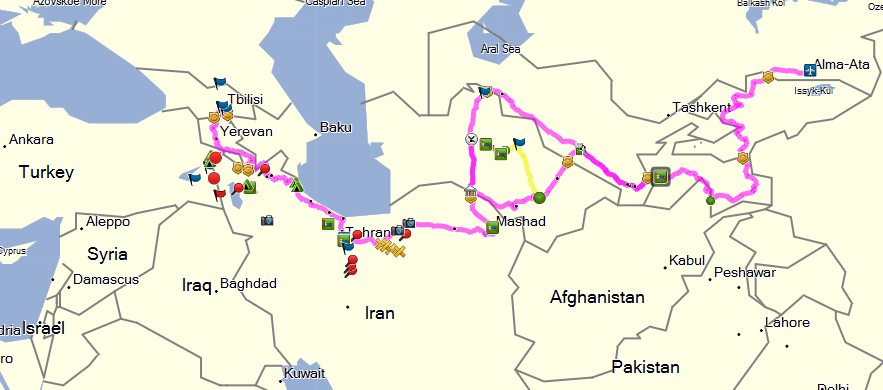 Ab Georgien werden wir via Armenien oder Aserbaidschan in den Iran, ans Kaspische Meer, Tehran, Maranjab, Mashad, Turkmenistan, Usbekistan, Tadschikistan, Kirgistan, Kasachstan, Almati-->heim