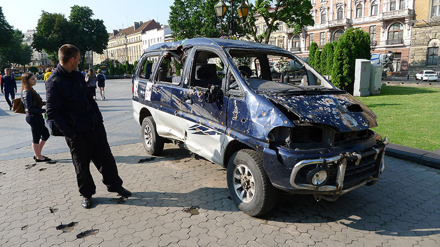| Ein Mahnmal, übriggebliebenes Zivilfahrzeug aus den Tagen der Majdan-Proteste in Lviv. |