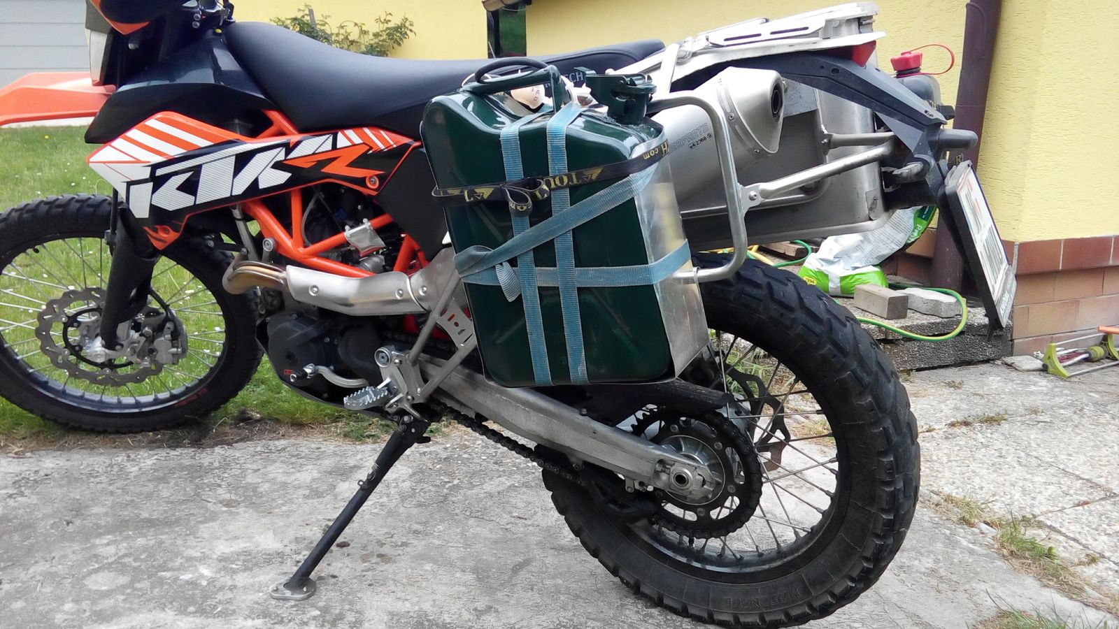 Das ist ein 10Liter Blechtank der mit Kraftstoff 12Kilo wiegt.Dar Kraftstoff wird bei der Endlüftung angesaugt.Nun habe ich ohne Umfüllen eine Reichweite von 450 km.
