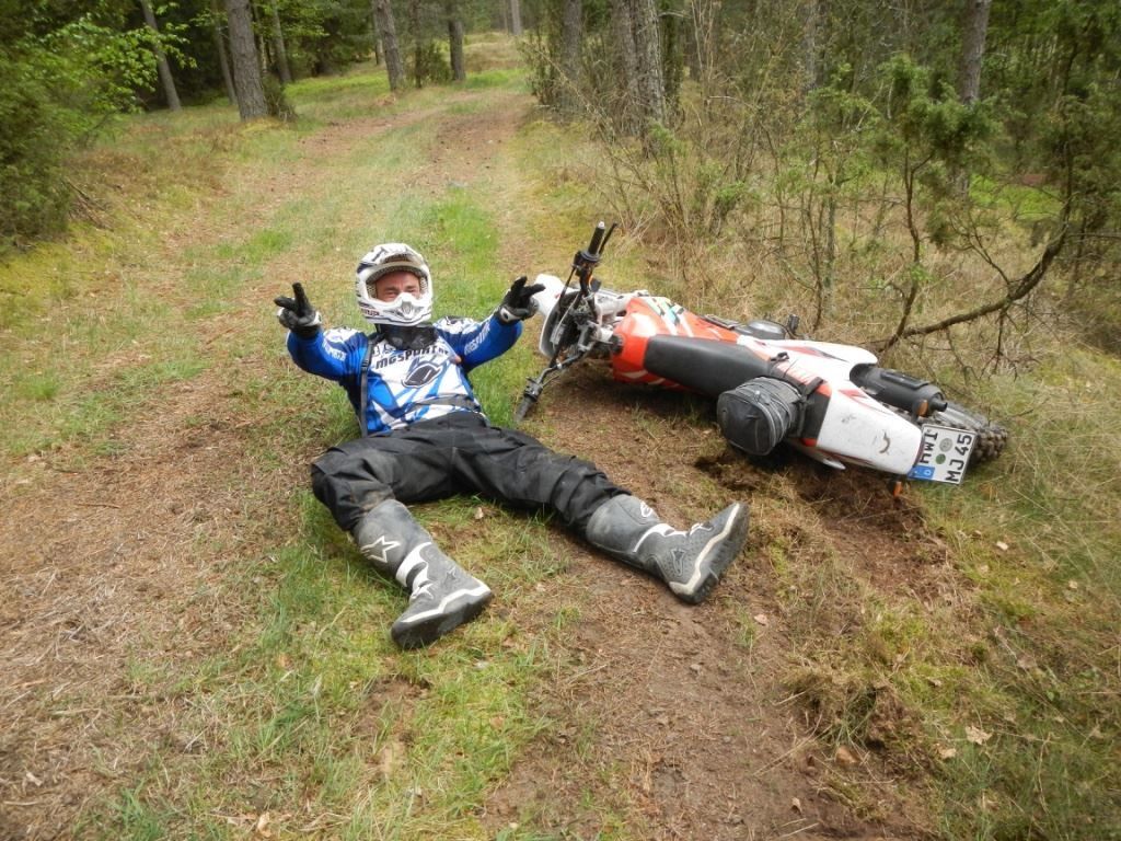 Unsere Wachkuh weckte uns immer sehr früh, also warteten wir bei Kaffee auf den nächsten Trip. Unsere Gruppe hatte sich um einen Fahrer verkleinert, der sich das Knie verdreht hatte, aber ein wenig Risiko ist natürlich immer dabei. Los ging es wieder durch die wunderschönen Wiesen, Wege und Wälder Kaschubiens an der alten deutsch-polnischen Grenze. Frank bot uns sogar noch Geschichtsunterricht in den Pausen, man glaubt es nicht! Schwierige Passagen wurden durch mich ausgelassen und ließen das Herz der Sportendurofahrer höher schlagen. Die Gruppe wurde immer homogener und wir verstanden uns perfekt, was will man mehr? Leider verließen mich und mein Dickschiff am Nachmittag die Kräfte und wir legten uns innerhalb weniger Minuten 2 Mal hin. Der Lenker war verbogen, ich war sauer auf mich selbst und da zeigte sich der Teamgeist dieser tollen Truppe. Sven sammelte das Moped auf, Hauke übernahm meine Dicke und ich fuhr langsam mit einer 250er GasGas zurück zum Hof. Danke Jungs!